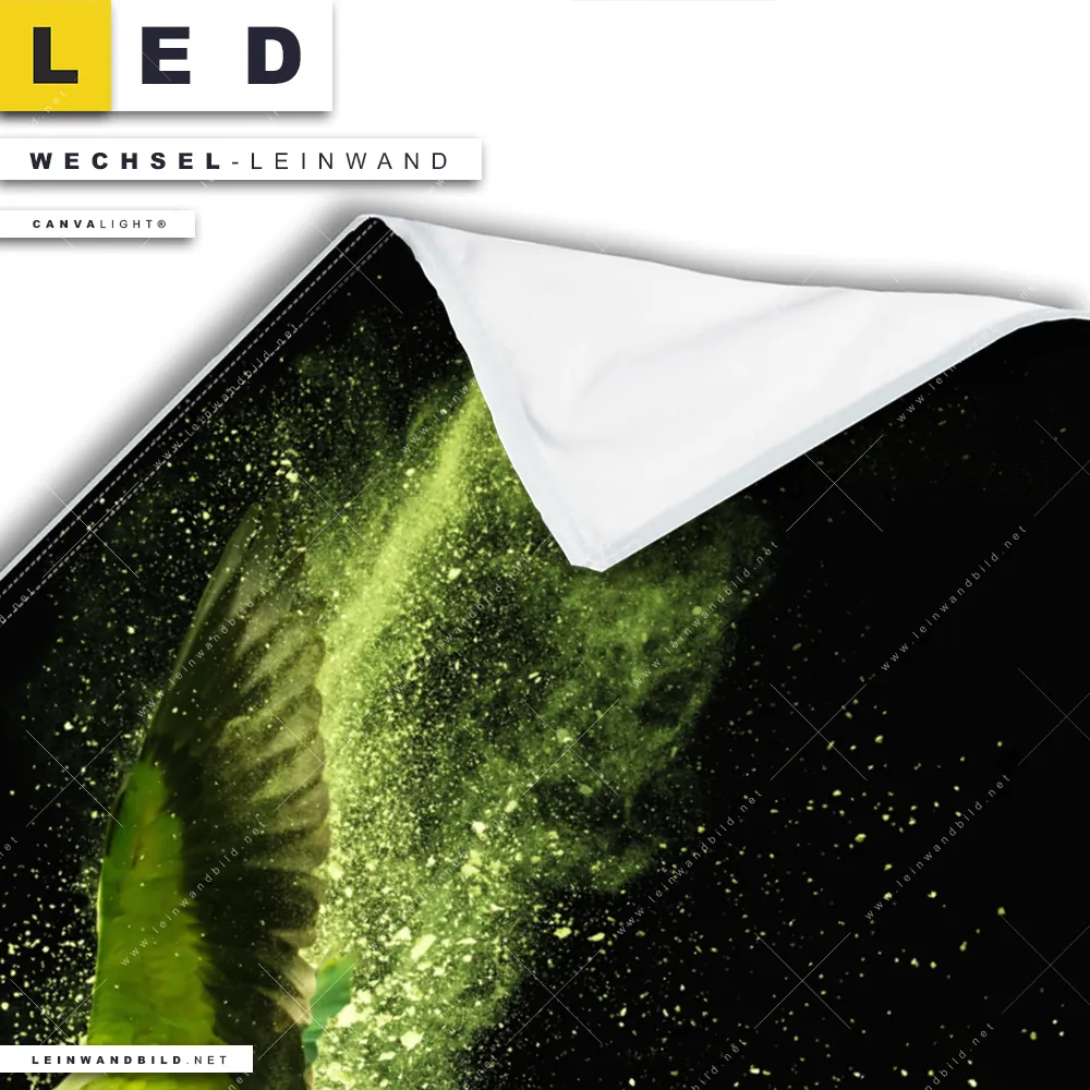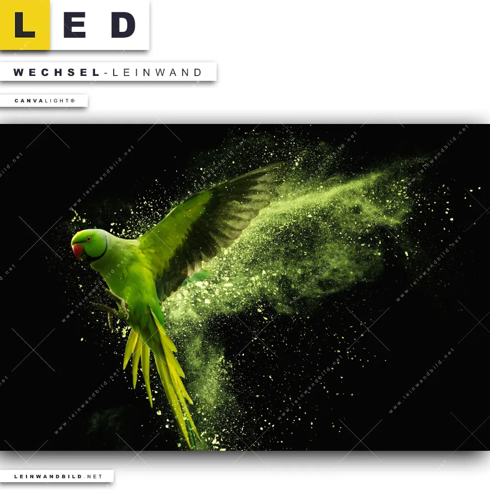 LED Wechsel-Leinwand Canvalight® TEX | Papagei - grüne Farbexplosion | Querformat