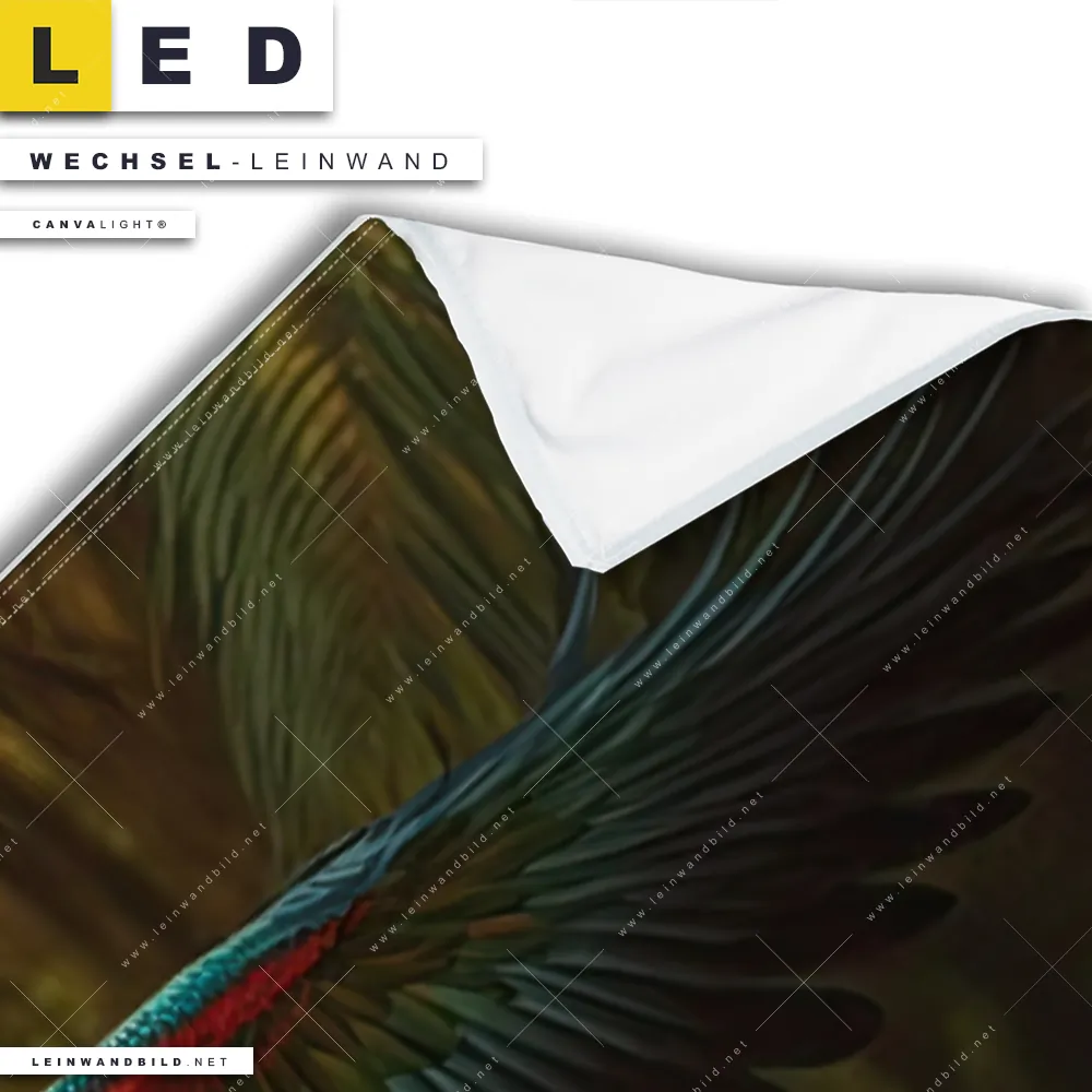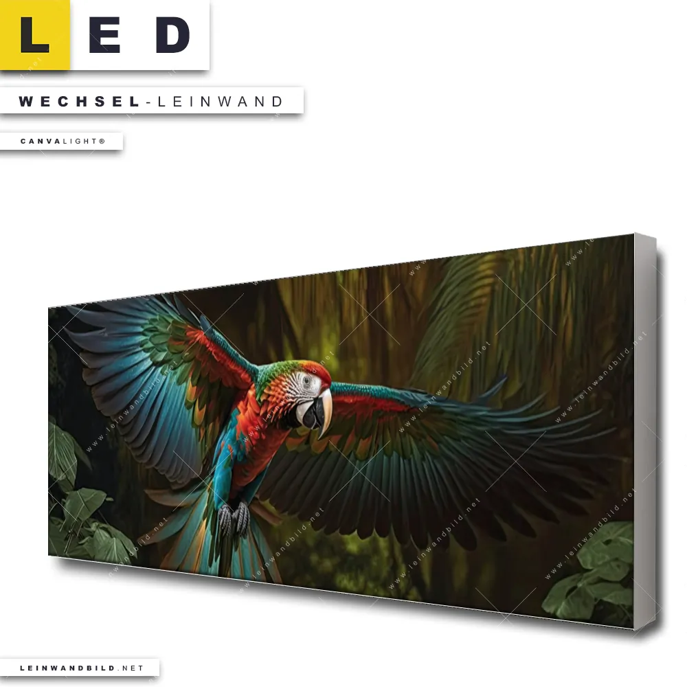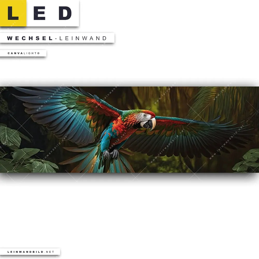 Du bist auf der Suche nach einer Tierwelt Wechsel-Leinwand für Dein LED-Leinwandbild im Panorama-Format? Begriffe wie Vogel, Papagei, Dschungel, Urwald, Natur, Exotisch, Tropisch haben Dich auf der Suche nach Deiner Ersatz-Leinwand für dein extra breites LED Wandbild mit wechselbarer Leinwand inspiriert? Farben wie Blau, Grün, Rot, Orange dürfen auf Deinem neuen Wechselmotiv für Dein XXL Leinwand-LED-Bild nicht fehlen und Leinwände im Natürlich - Realistisch, Modern Art Stil für Leuchtbilder passen perfekt zu Deinem Einrichtungsstil?