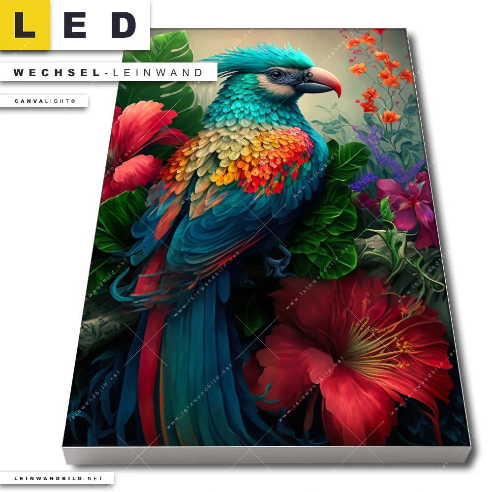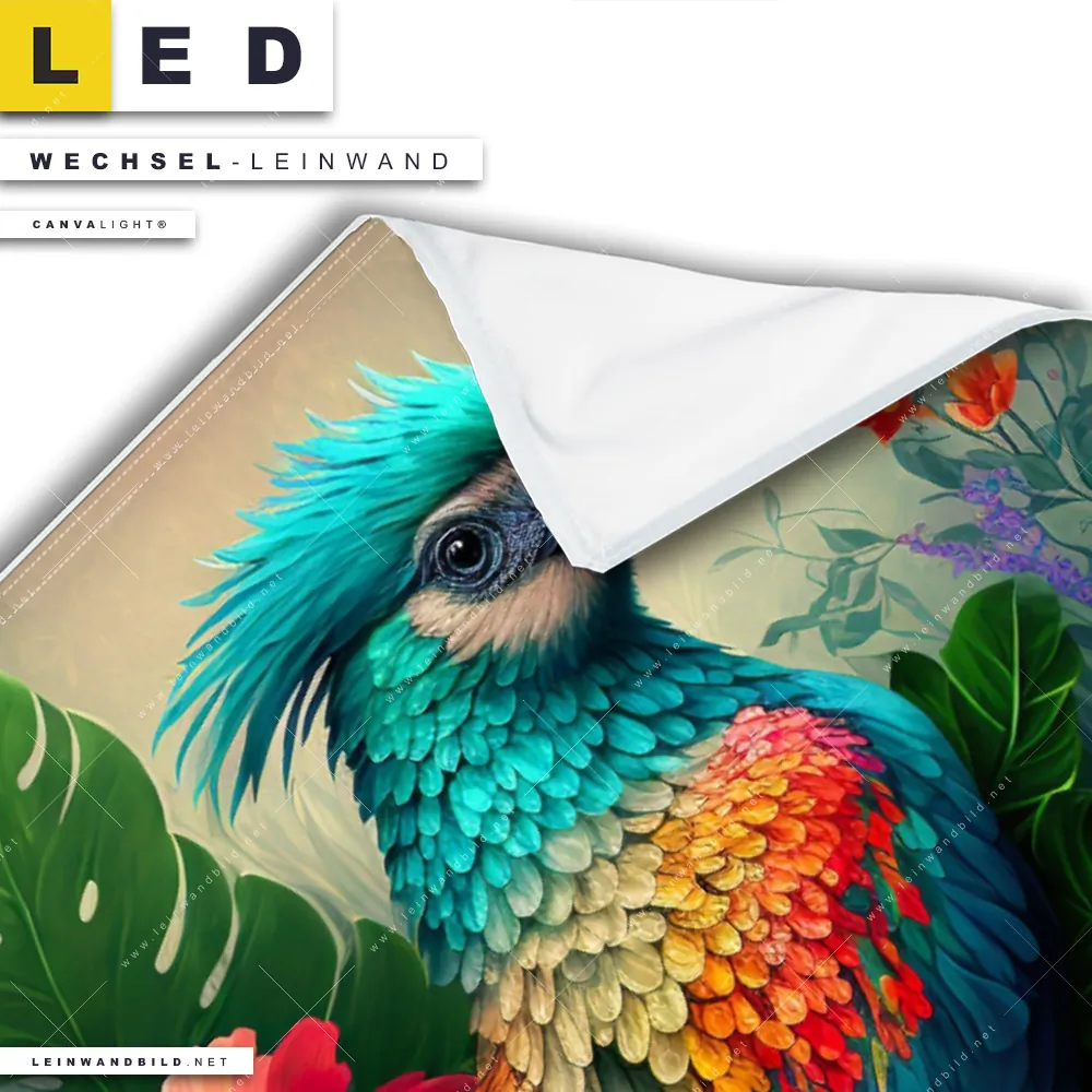 LED Wechsel-Leinwand Canvalight® TEX | Papagei und tropischer Hibiskus | Hochformat