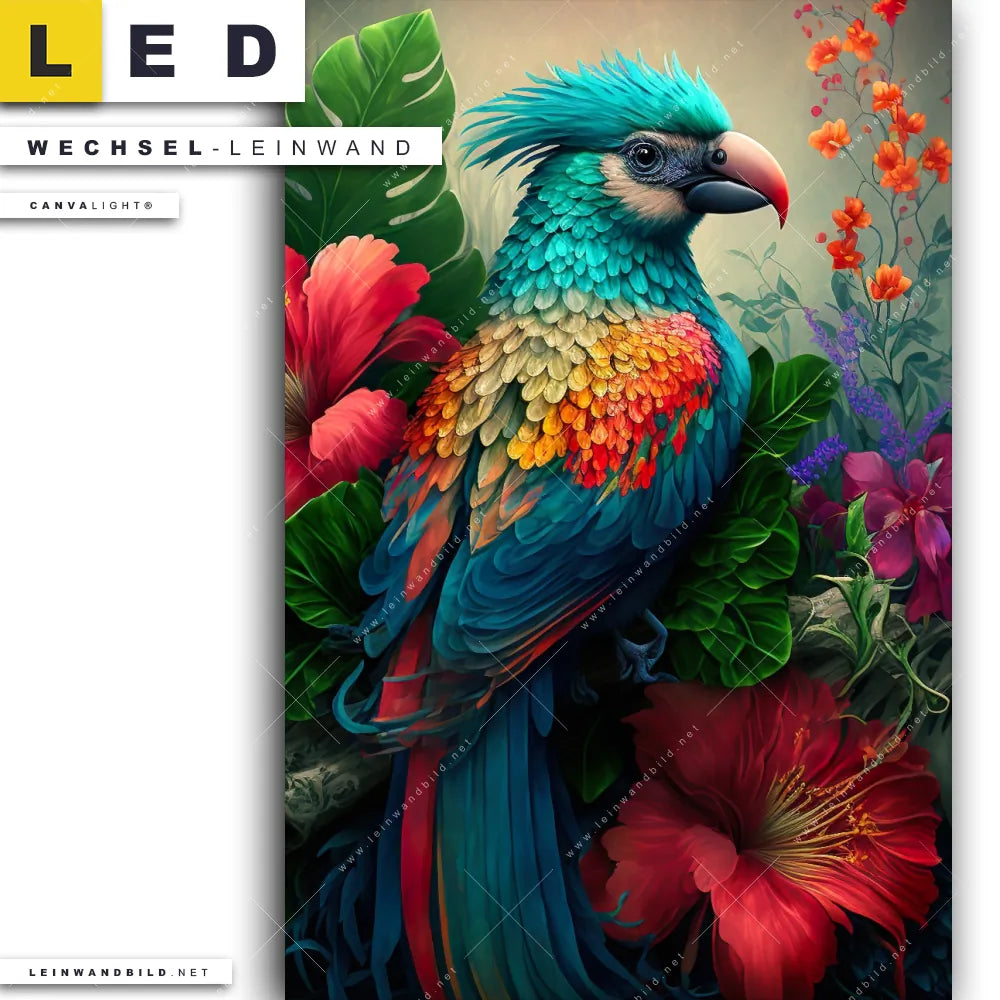 Du bist auf der Suche nach einer Tierwelt, Blumen - Botanik Wechsel-Leinwand für Dein LED-Leinwandbild im Hochformat? Begriffe wie Vogel, Papagei, Dschungel, Farbe, bunt, Blätter, Blüten, Blumen haben Dich auf der Suche nach Deiner Ersatz-Leinwand für dein LED Wandbild mit wechselbarer Leinwand inspiriert? Farben wie Blau, Grün, Rot dürfen auf Deinem neuen Wechselmotiv für Dein XXL Leinwand-LED-Bild nicht fehlen und Leinwände im Floral, Modern Art Stil für Leuchtbilder passen perfekt zu Deinem Einrichtungsstil?