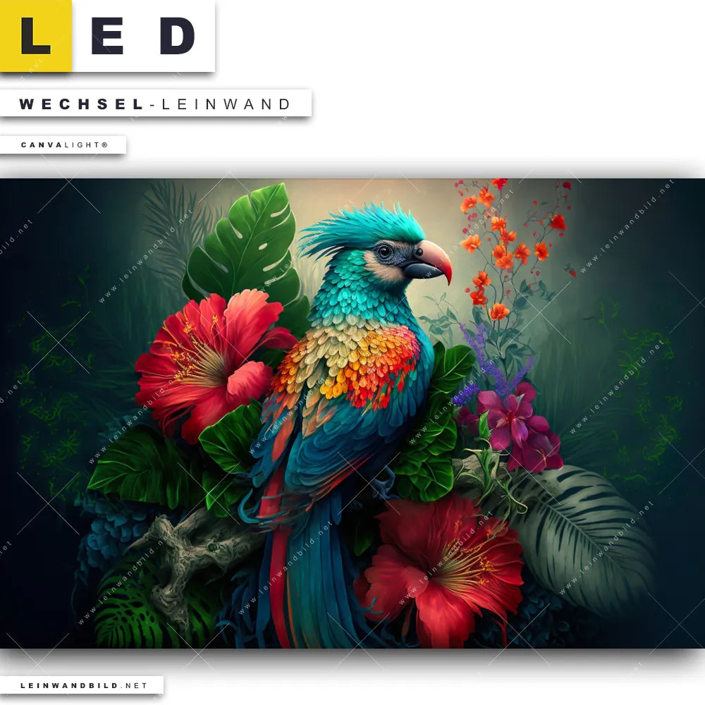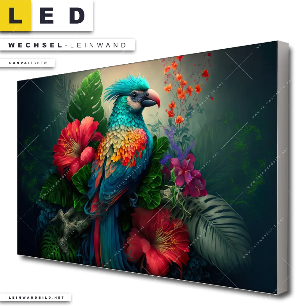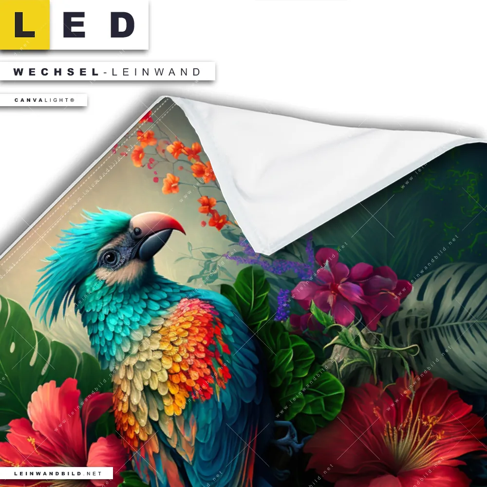 Du bist auf der Suche nach einer Tierwelt, Blumen - Botanik Wechsel-Leinwand für Dein LED-Leinwandbild im Querformat? Begriffe wie Vogel, Papagei, Dschungel, Farbe, bunt, Blätter, Blüten, Blumen haben Dich auf der Suche nach Deiner Ersatz-Leinwand für dein breites LED Wandbild mit wechselbarer Leinwand inspiriert? Farben wie Blau, Grün, Rot dürfen auf Deinem neuen Wechselmotiv für Dein XXL Leinwand-LED-Bild nicht fehlen und Leinwände im Floral, Modern Art Stil für Leuchtbilder passen perfekt zu Deinem Einrichtungsstil?