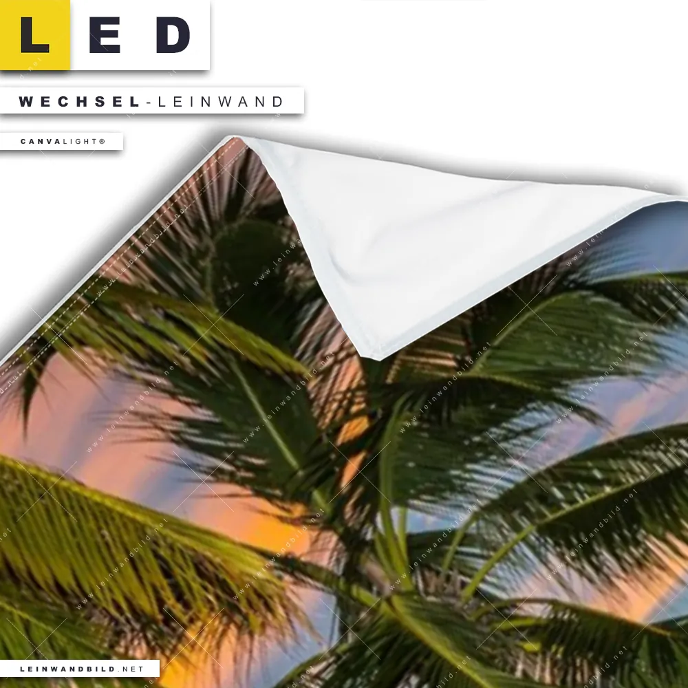 Bitte beachte, dass die Farben, der auf dem Monitor abgebildeten Karibische Palmen Darstellung, möglicherweise von den Originalfarben deiner Canvalight® TEX Wechsel-Leinwand abweichen können.