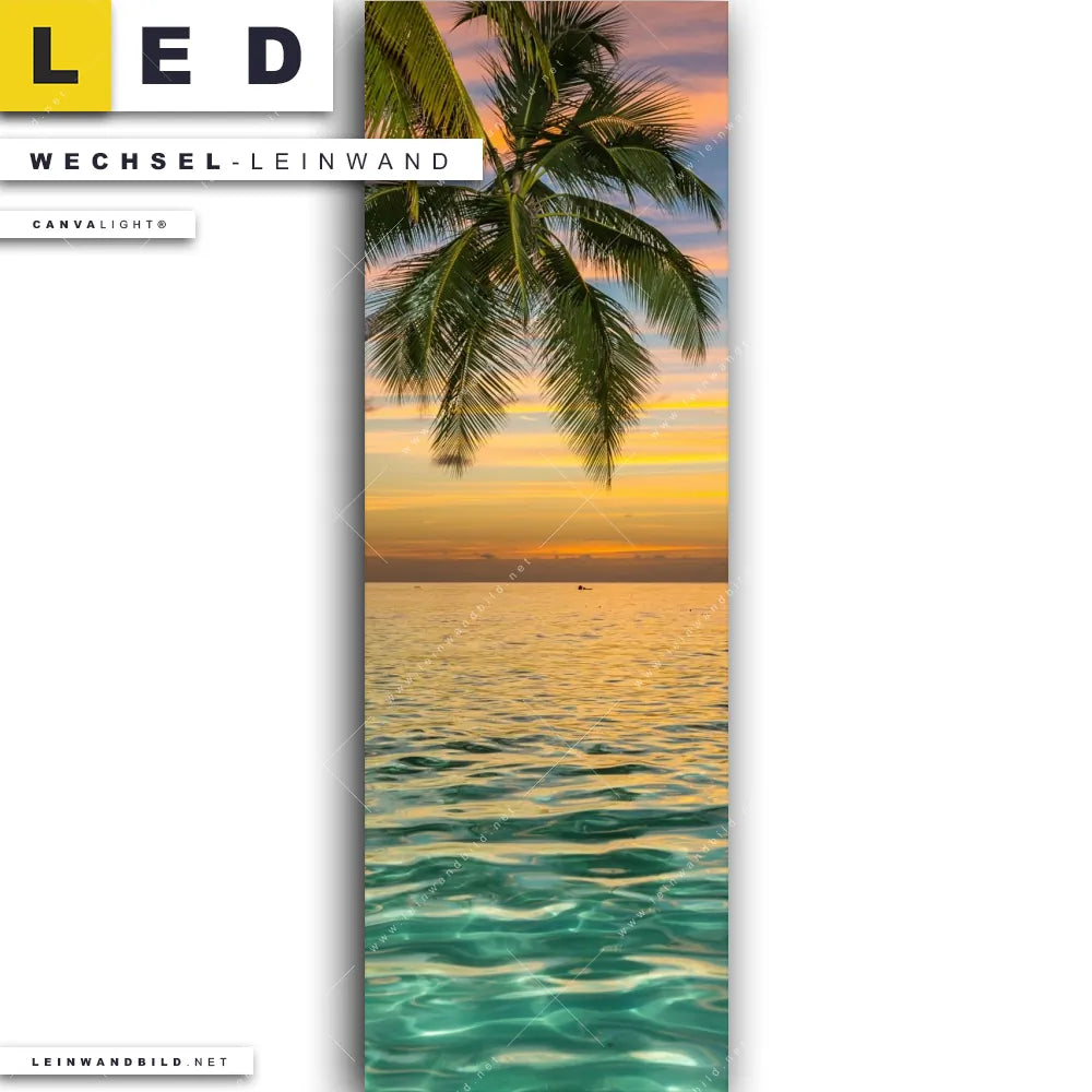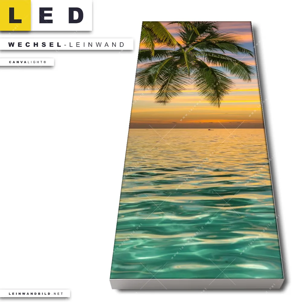 Du bist auf der Suche nach einer Landschaften, Strand - Meer Wechsel-Leinwand für Dein LED-Leinwandbild im Schmalen Format? Begriffe wie Palmen, Horizont, Ozean, Insel, Meer, Sommer, Südsee - Karibik, Urlaub - Reisen, Sonnenuntergang - Sonnenaufgang haben Dich auf der Suche nach Deiner Ersatz-Leinwand für dein LED Wandbild im Panorama-Hochformat mit wechselbarer Leinwand inspiriert? Farben wie Orange, Grün, Blau dürfen auf Deinem neuen Wechselmotiv für Dein XXL Leinwand-LED-Bild nicht fehlen und Leinwände im Retro - Vintage, Natürlich - Realistisch Stil für Leuchtbilder passen perfekt zu Deinem Einrichtungsstil?