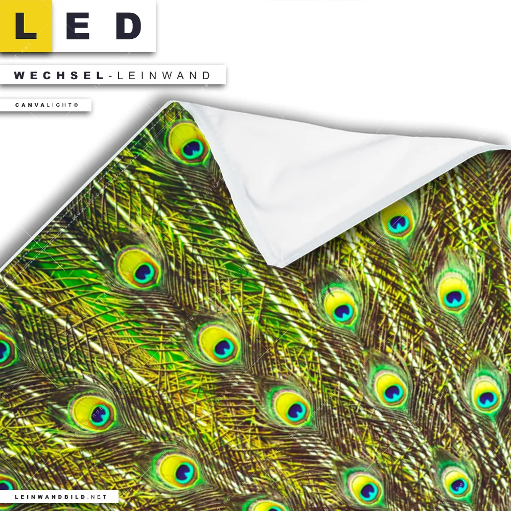 Du bist auf der Suche nach einer Tierwelt Wechsel-Leinwand für Dein LED-Leinwandbild im Hochformat? Begriffe wie Vogel, Pfau, Dschungel, Pfauenschwanz, Pfauenfedern haben Dich auf der Suche nach Deiner Ersatz-Leinwand für dein LED Wandbild mit wechselbarer Leinwand inspiriert? Farben wie Grün, Bunt, Hellblau, Hellgrün dürfen auf Deinem neuen Wechselmotiv für Dein XXL Leinwand-LED-Bild nicht fehlen und Leinwände im Natürlich - Realistisch Stil für Leuchtbilder passen perfekt zu Deinem Einrichtungsstil?