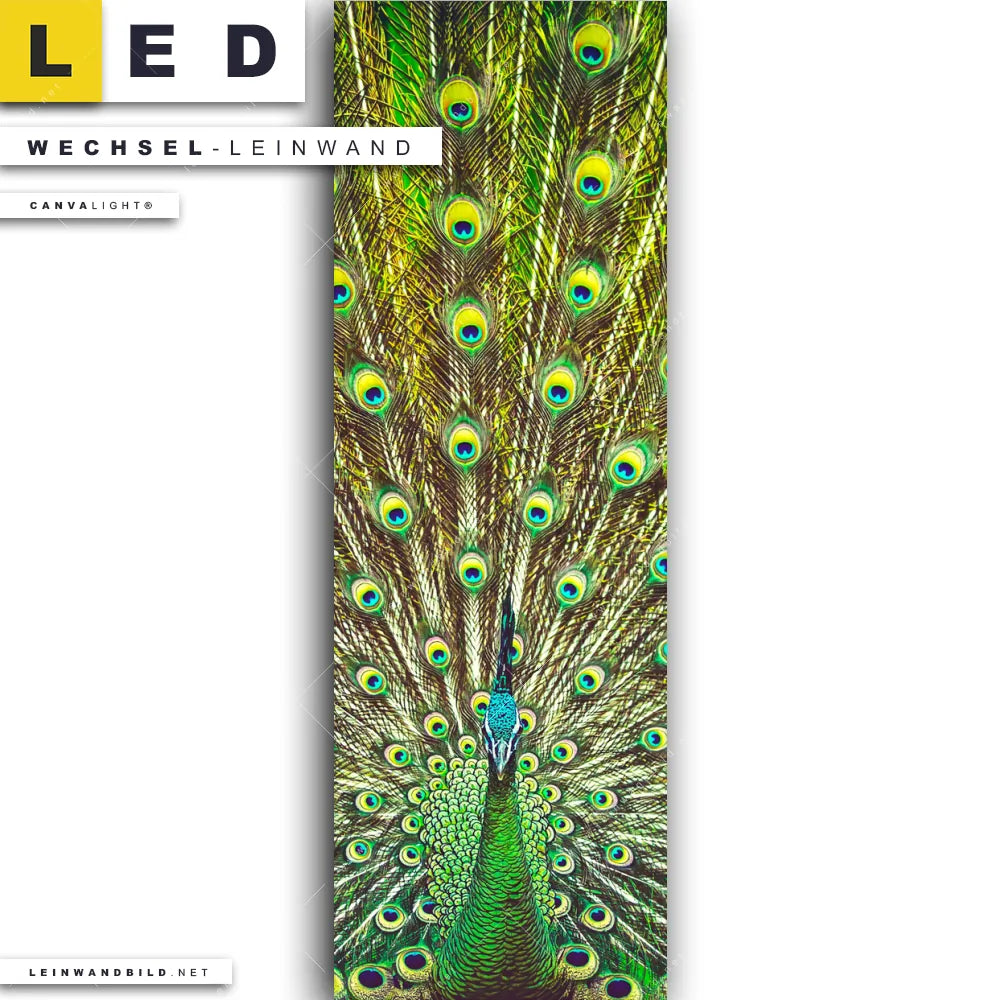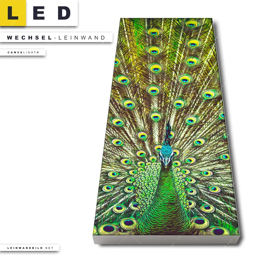 Du bist auf der Suche nach einer Tierwelt Wechsel-Leinwand für Dein LED-Leinwandbild im Schmalen Format? Begriffe wie Vogel, Pfau, Dschungel, Pfauenschwanz, Pfauenfedern haben Dich auf der Suche nach Deiner Ersatz-Leinwand für dein LED Wandbild im Panorama-Hochformat mit wechselbarer Leinwand inspiriert? Farben wie Grün, Bunt, Hellblau, Hellgrün dürfen auf Deinem neuen Wechselmotiv für Dein XXL Leinwand-LED-Bild nicht fehlen und Leinwände im Natürlich - Realistisch Stil für Leuchtbilder passen perfekt zu Deinem Einrichtungsstil?