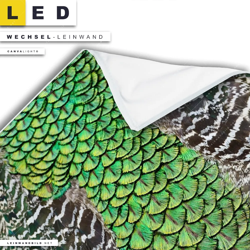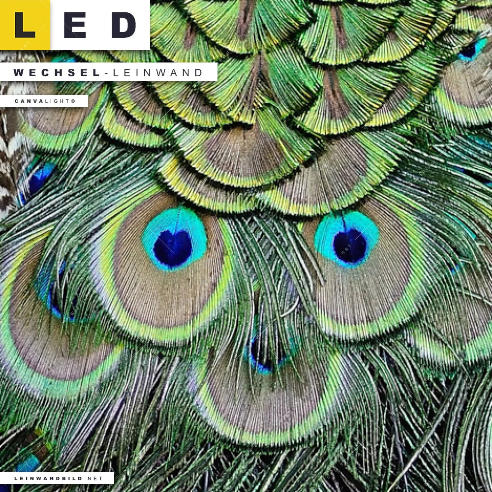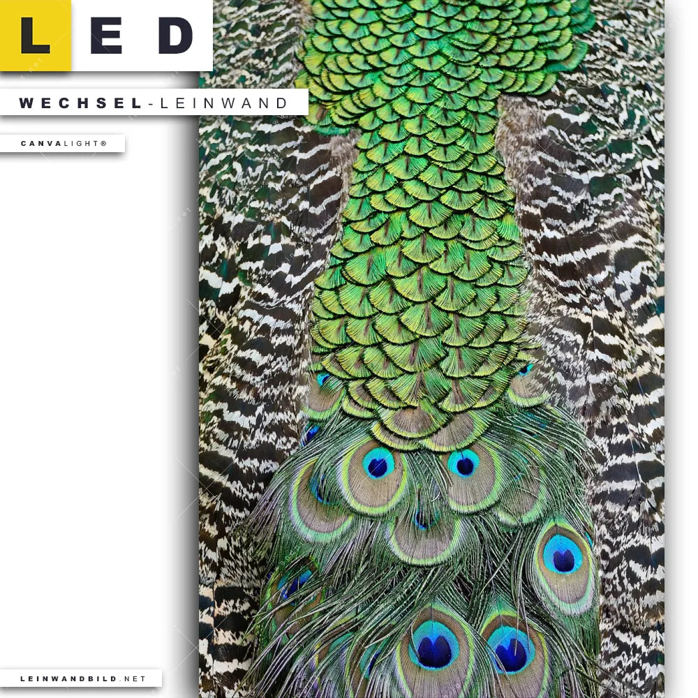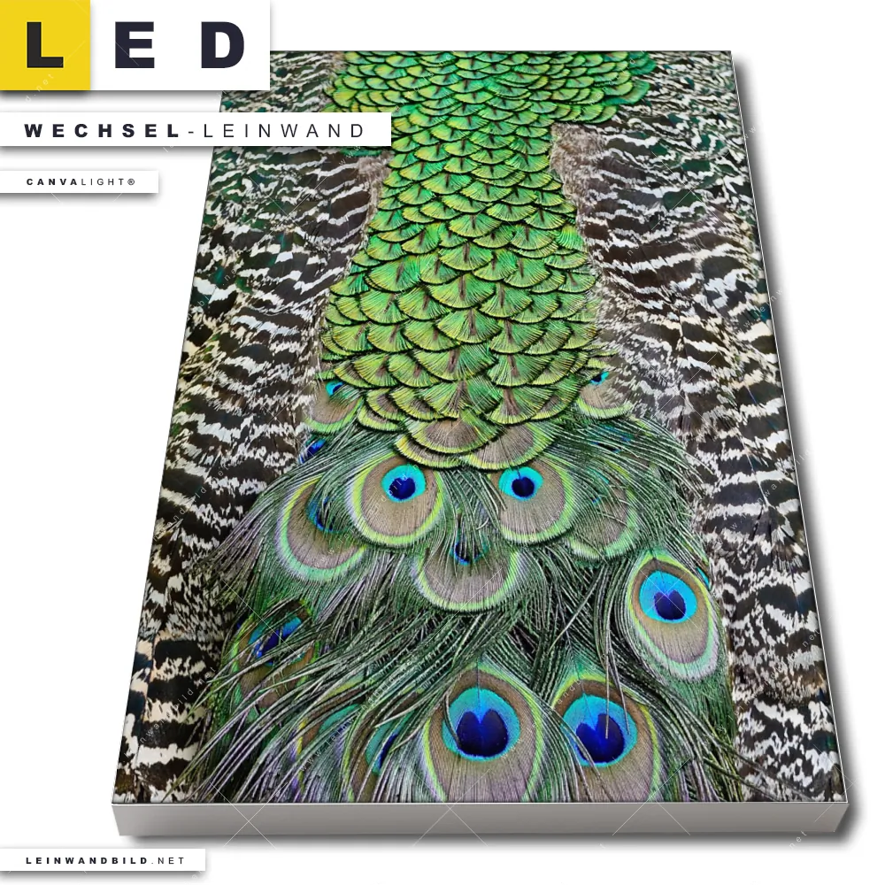 Du bist auf der Suche nach einer Tierwelt, Muster - Texturen Wechsel-Leinwand für Dein LED-Leinwandbild im Hochformat? Begriffe wie Vogel, Pfau, Dschungel, Federn, Pfaufedern haben Dich auf der Suche nach Deiner Ersatz-Leinwand für dein LED Wandbild mit wechselbarer Leinwand inspiriert? Farben wie Grün, Blau dürfen auf Deinem neuen Wechselmotiv für Dein XXL Leinwand-LED-Bild nicht fehlen und Leinwände im Natürlich - Realistisch Stil für Leuchtbilder passen perfekt zu Deinem Einrichtungsstil?