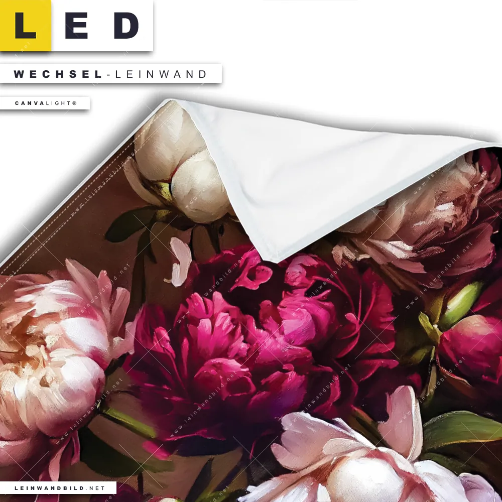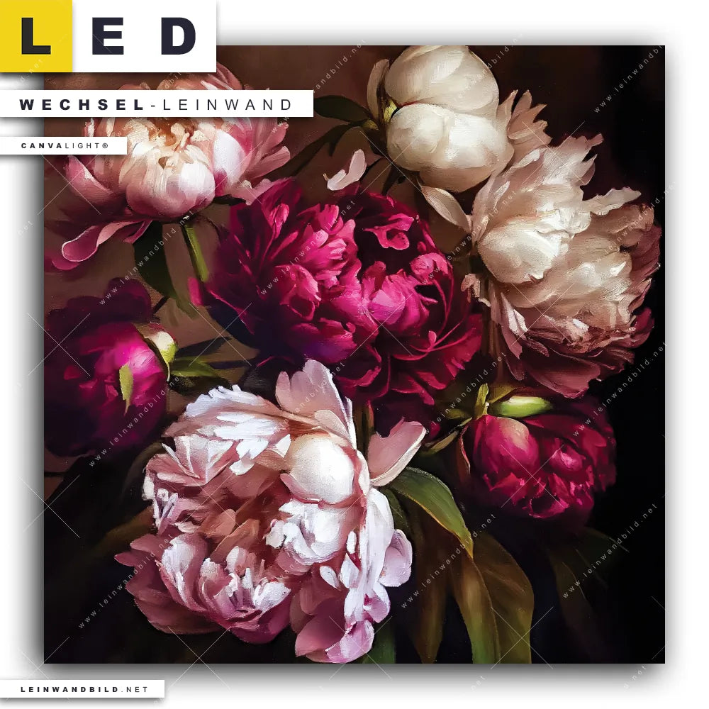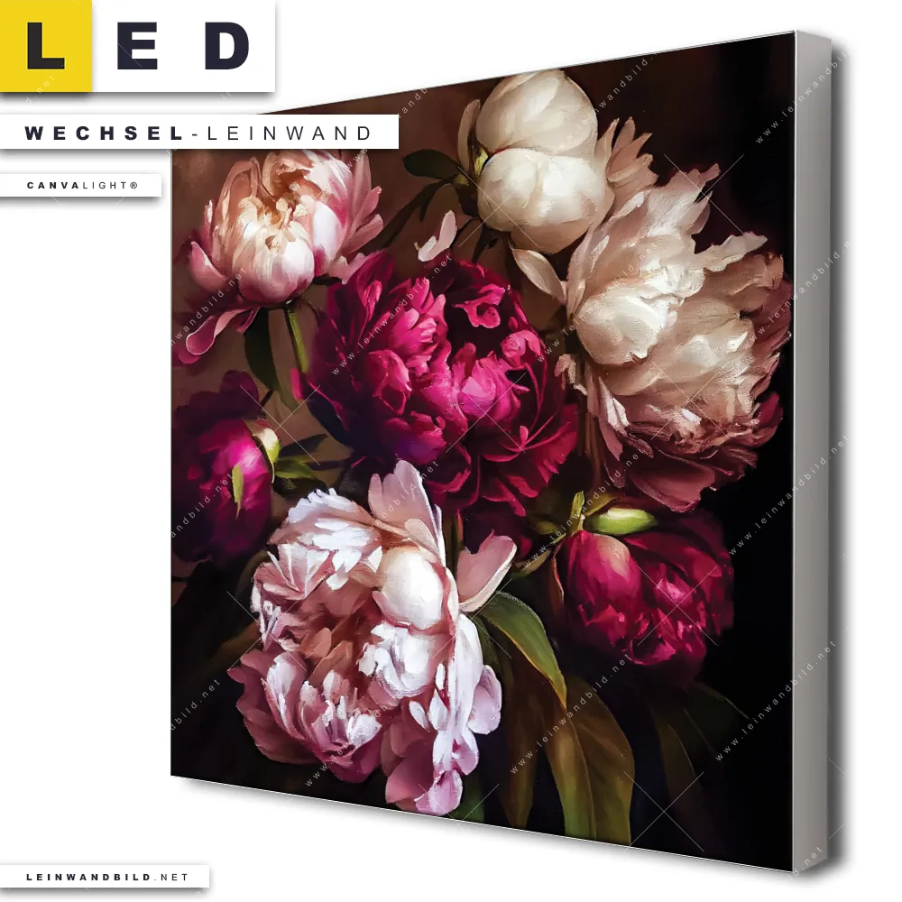 Du konfigurierst Deine individuelle LED Wechsel-Leinwand Canvalight® TEX | Pfingstrosen im Barockstil | Quadrat und wir produzieren sie NEU für Dich. Unsere Blumen - Botanik Austausch-Fotoleinwände für Canvalight® LED Bilder sind KEINE Lagerware. Du bist Dir unsicher, welches Motiv oder Format das richtige für dein individuelles LED Wechselmotiv auf Leinwand ist, dann helfen wir dir gerne weiter und beraten dich!