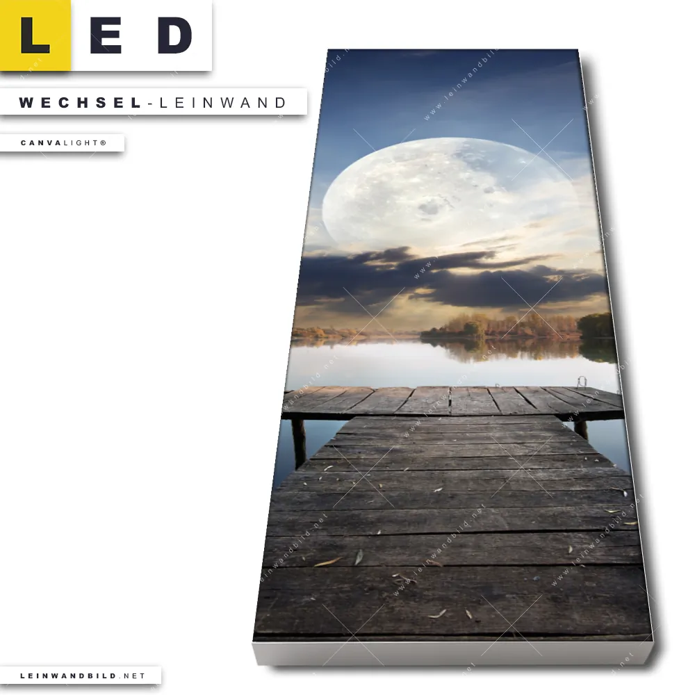 Du bist auf der Suche nach einer Landschaften Wechsel-Leinwand für Dein LED-Leinwandbild im Schmalen Format? Begriffe wie Fluss, See, Steg, Mond, Angeln, Teich, Herbst, Fischen, Vollmond haben Dich auf der Suche nach Deiner Ersatz-Leinwand für dein LED Wandbild im Panorama-Hochformat mit wechselbarer Leinwand inspiriert? Farben wie Blau, Braun, Weiss dürfen auf Deinem neuen Wechselmotiv für Dein XXL Leinwand-LED-Bild nicht fehlen und Leinwände im Natürlich - Realistisch, Retro - Vintage Stil für Leuchtbilder passen perfekt zu Deinem Einrichtungsstil?