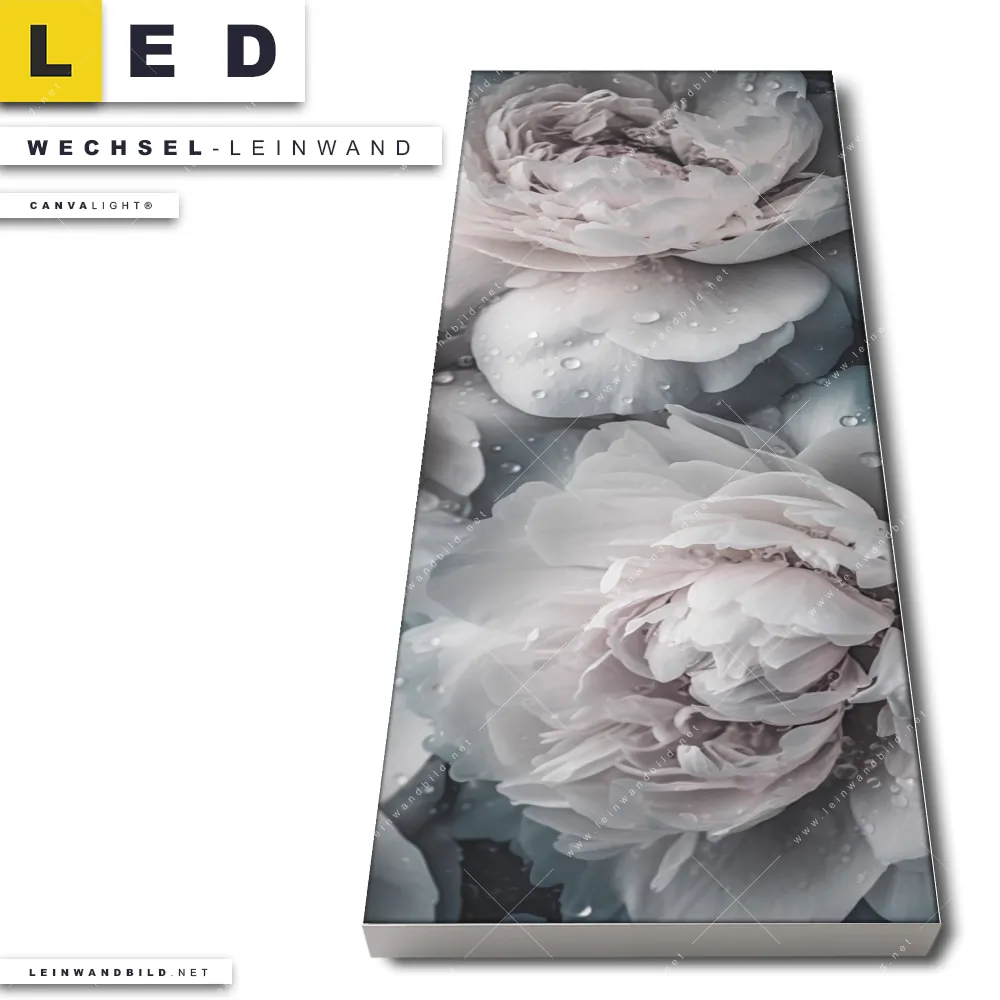 Du bist auf der Suche nach einer Blumen - Botanik Wechsel-Leinwand für Dein LED-Leinwandbild im Schmalen Format? Begriffe wie Pfingstrose, Pflanze, Natur, Nahaufnahme, Draufsicht, Wassertropfen, Blüten, Rose haben Dich auf der Suche nach Deiner Ersatz-Leinwand für dein LED Wandbild im Panorama-Hochformat mit wechselbarer Leinwand inspiriert? Farben wie Weiss, Rosa, Grau dürfen auf Deinem neuen Wechselmotiv für Dein XXL Leinwand-LED-Bild nicht fehlen und Leinwände im Floral, Retro - Vintage, Schwarz - Weiss Stil für Leuchtbilder passen perfekt zu Deinem Einrichtungsstil?
