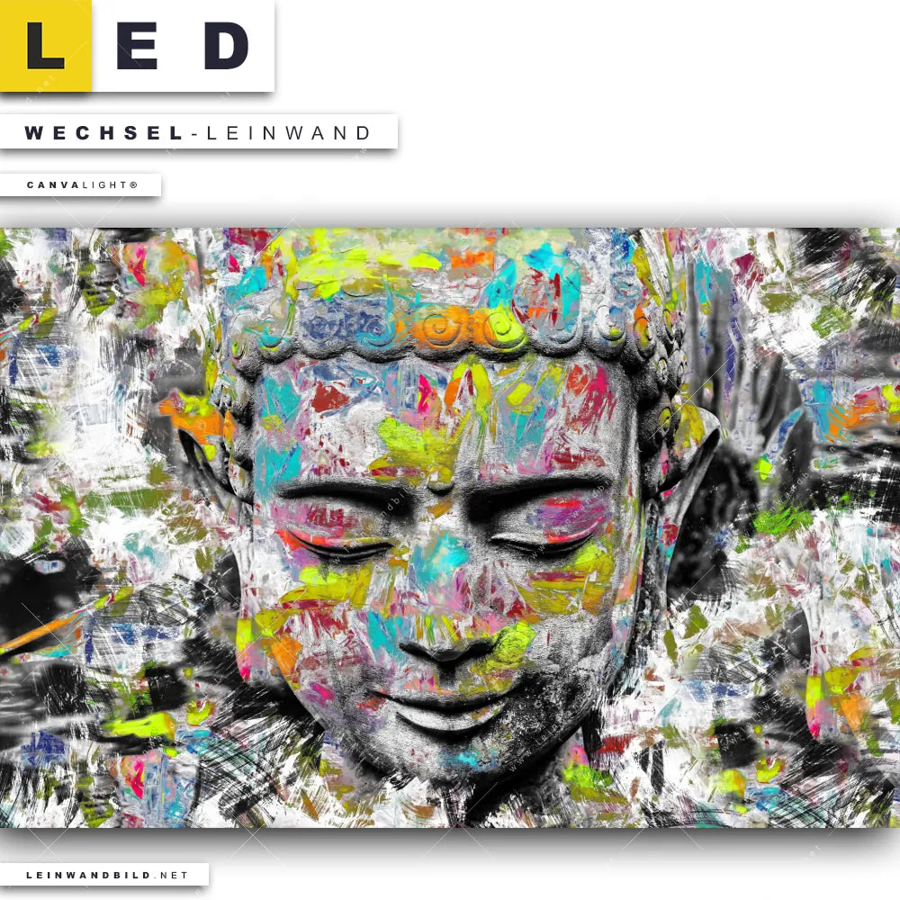 Du bist auf der Suche nach einer Buddha - Feng Shui Wechsel-Leinwand für Dein LED-Leinwandbild im Querformat? Begriffe wie Buddhismus, Religion, Zen, Meditation, Buddha, Statue, Kopf, Gesicht haben Dich auf der Suche nach Deiner Ersatz-Leinwand für dein breites LED Wandbild mit wechselbarer Leinwand inspiriert? Farben wie Bunt, Weiss, Schwarz, Grau dürfen auf Deinem neuen Wechselmotiv für Dein XXL Leinwand-LED-Bild nicht fehlen und Leinwände im Modern Art, Mixed Media, Abstrakt, Pop Art, Street Art Stil für Leuchtbilder passen perfekt zu Deinem Einrichtungsstil?