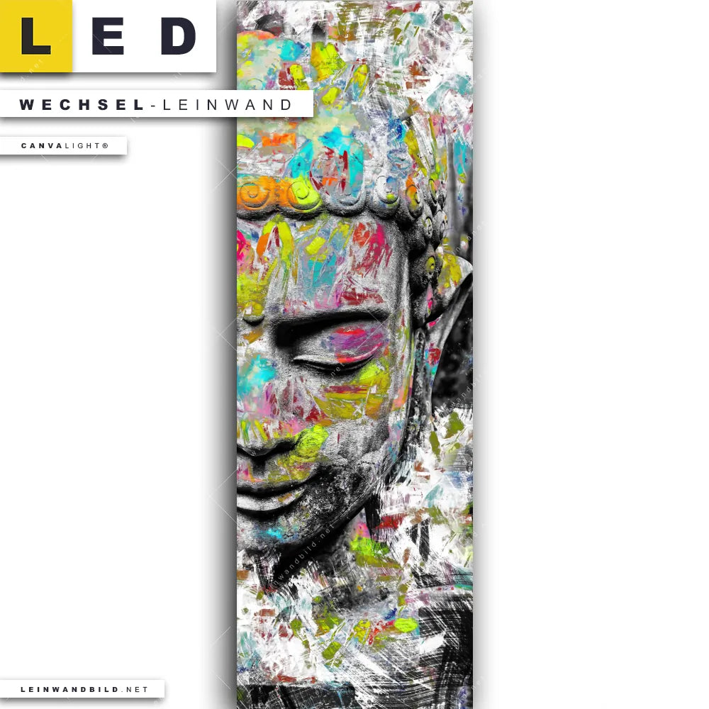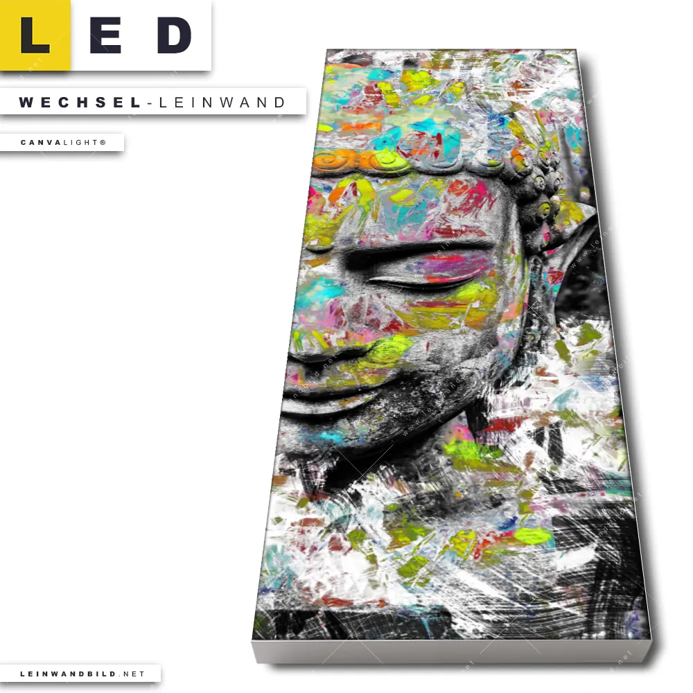 Du bist auf der Suche nach einer Buddha - Feng Shui Wechsel-Leinwand für Dein LED-Leinwandbild im Schmalen Format? Begriffe wie Buddhismus, Religion, Zen, Meditation, Buddha, Statue, Kopf, Gesicht haben Dich auf der Suche nach Deiner Ersatz-Leinwand für dein LED Wandbild im Panorama-Hochformat mit wechselbarer Leinwand inspiriert? Farben wie Bunt, Weiss, Schwarz, Grau dürfen auf Deinem neuen Wechselmotiv für Dein XXL Leinwand-LED-Bild nicht fehlen und Leinwände im Modern Art, Mixed Media, Abstrakt, Pop Art, Street Art Stil für Leuchtbilder passen perfekt zu Deinem Einrichtungsstil?
