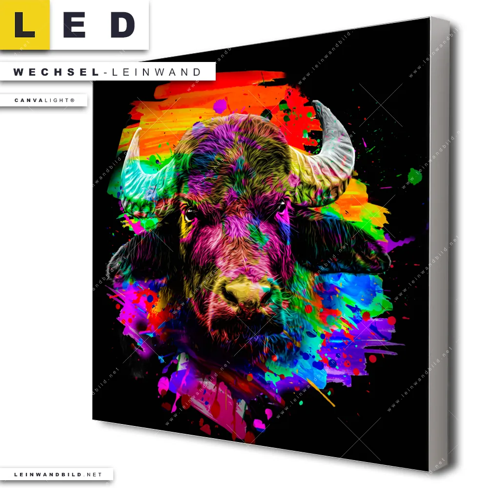 Du bist auf der Suche nach einer Tierwelt Wechsel-Leinwand für Dein LED-Leinwandbild im Quadratischen Format? Begriffe wie Tier, Stier, Hochlandkuh, Highlander, Büffel, Splash, Farbspritzer, Rind, Farbe, Kuh haben Dich auf der Suche nach Deiner Ersatz-Leinwand für dein LED Wandbild mit wechselbarer Leinwand inspiriert? Farben wie Bunt, Schwarz dürfen auf Deinem neuen Wechselmotiv für Dein XXL Leinwand-LED-Bild nicht fehlen und Leinwände im Abstrakt, Modern Art, Pop Art Stil für Leuchtbilder passen perfekt zu Deinem Einrichtungsstil?