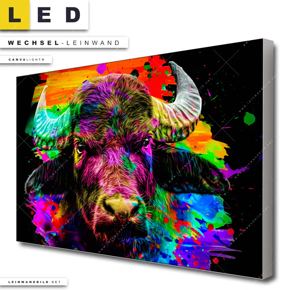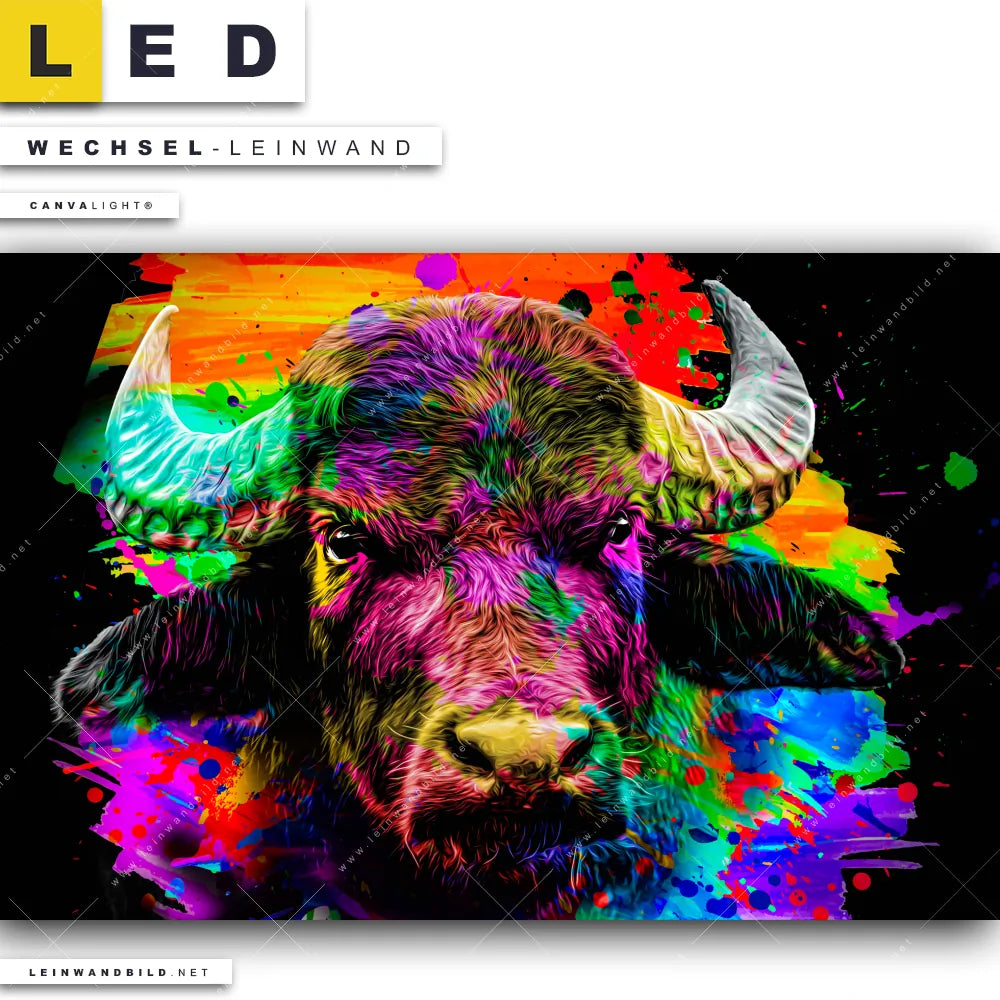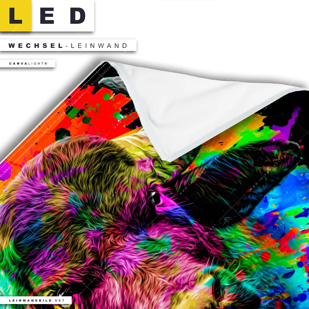 Du bist auf der Suche nach einer Tierwelt Wechsel-Leinwand für Dein LED-Leinwandbild im Querformat? Begriffe wie Tier, Stier, Hochlandkuh, Highlander, Büffel, Splash, Farbspritzer, Rind, Farbe, Kuh haben Dich auf der Suche nach Deiner Ersatz-Leinwand für dein breites LED Wandbild mit wechselbarer Leinwand inspiriert? Farben wie Bunt, Schwarz dürfen auf Deinem neuen Wechselmotiv für Dein XXL Leinwand-LED-Bild nicht fehlen und Leinwände im Abstrakt, Modern Art, Pop Art Stil für Leuchtbilder passen perfekt zu Deinem Einrichtungsstil?