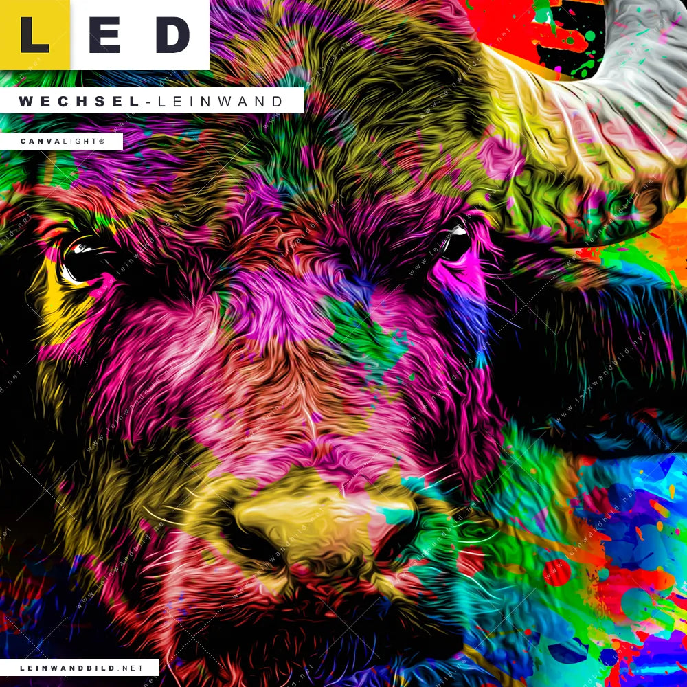 Dann sollte die Wechsel-Leinwand Canvalight® TEX | Pop Art Stier | Querformat den Weg zu Dir finden. Die Austausch-Leinwand bunter Stier - passend für unsere stufenlos dimmbaren, steckerfertigen Leinwandbilder im Leuchtrahmen mit Fernbedienung und optionaler Farbtemperatursteuerung - fügt sich als Eye-Catcher harmonisch in jedes Bar - Gastronomie, Wohnzimmer - Schlafzimmer, Flur - Eingangsbereich, Büro - Kanzlei Raumkonzept ein.
