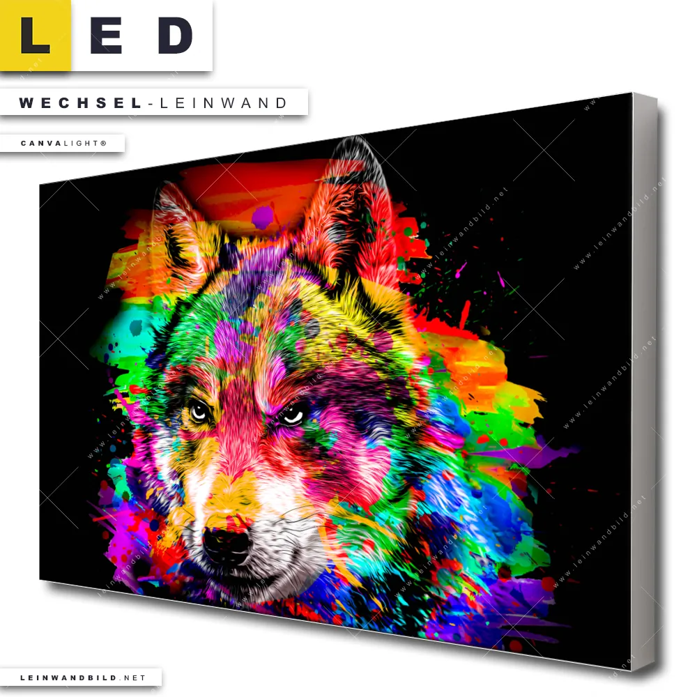 Du bist auf der Suche nach einer Tierwelt Wechsel-Leinwand für Dein LED-Leinwandbild im Querformat? Begriffe wie Wolf, Wald, Splash, Farbspritzer, Wölfin, Farbexplosion, Porträt haben Dich auf der Suche nach Deiner Ersatz-Leinwand für dein breites LED Wandbild mit wechselbarer Leinwand inspiriert? Farben wie Bunt, Schwarz dürfen auf Deinem neuen Wechselmotiv für Dein XXL Leinwand-LED-Bild nicht fehlen und Leinwände im Abstrakt, Modern Art, Pop Art Stil für Leuchtbilder passen perfekt zu Deinem Einrichtungsstil?
