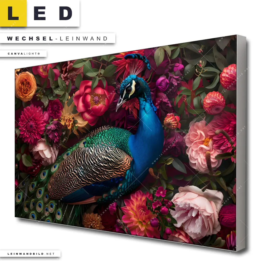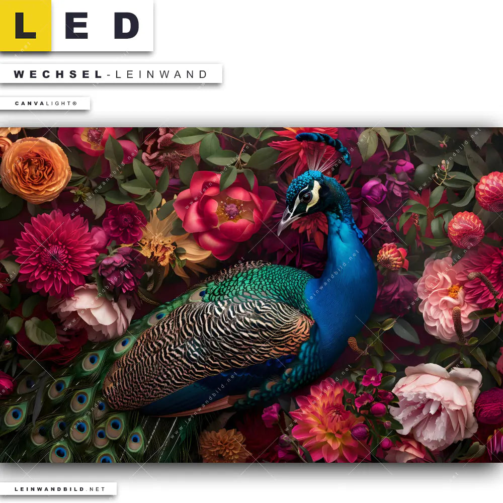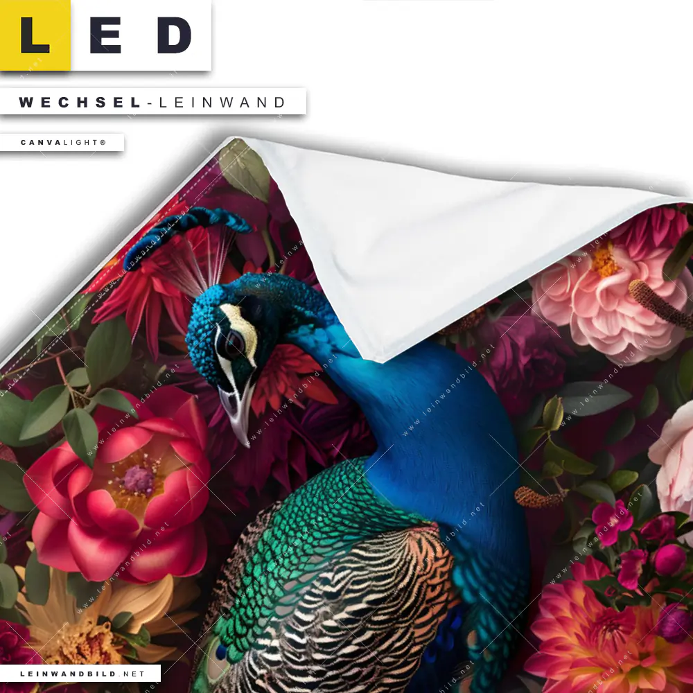 LED Wechsel-Leinwand Canvalight® TEX | Prachtvoller Pfau und Blüten | Querformat