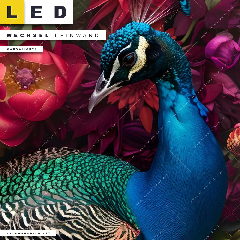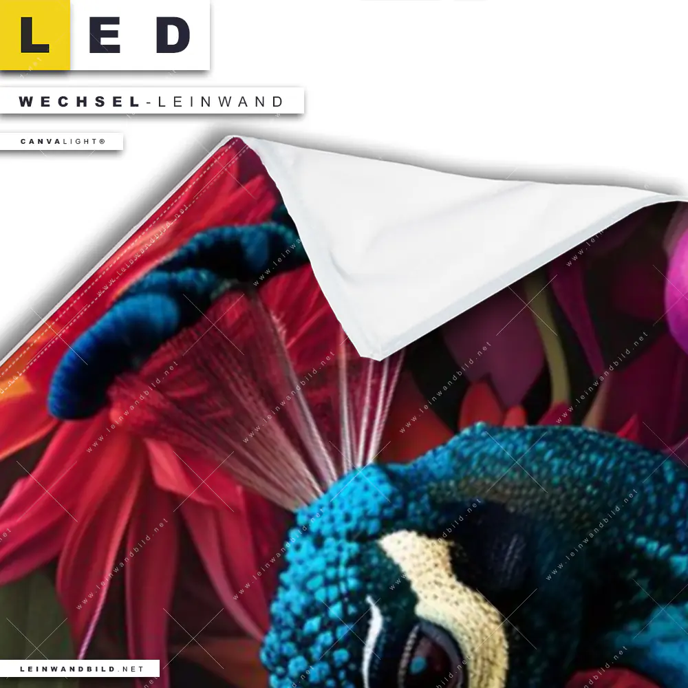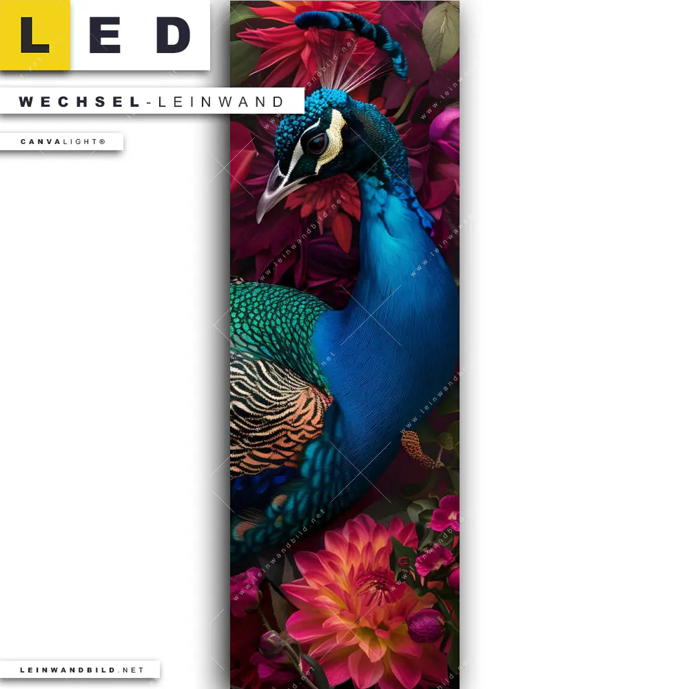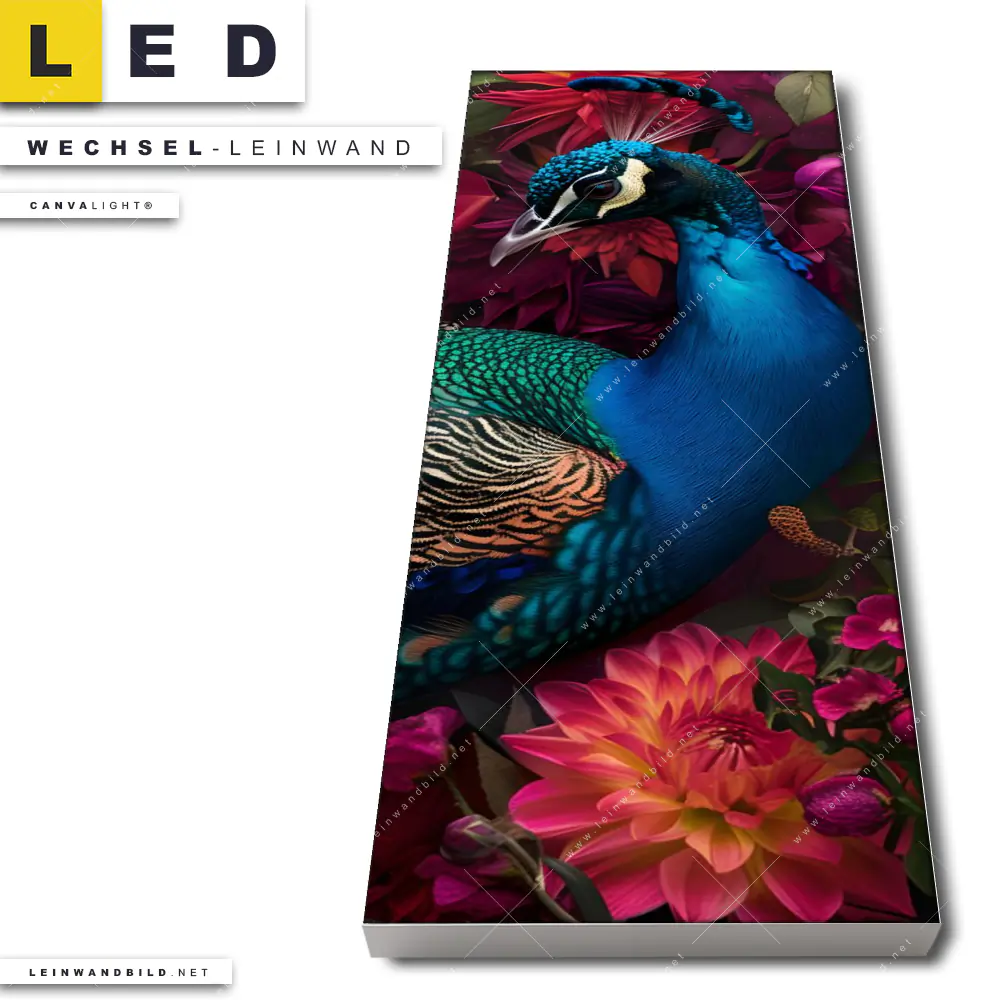 LED Wechsel-Leinwand Canvalight® TEX | Prachtvoller Pfau und Blüten | Schmal