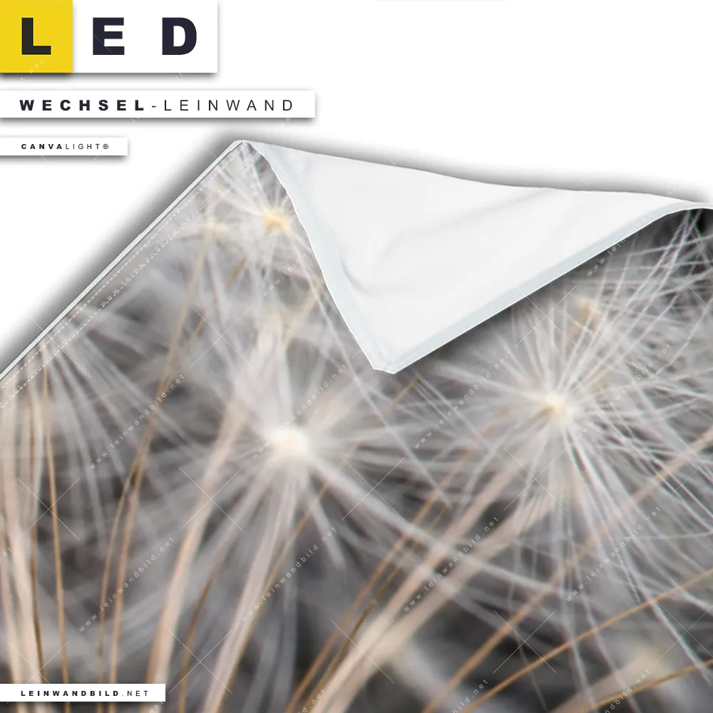 Bitte beachte, dass die Farben, der auf dem Monitor abgebildeten Flugsamen an Löwenzahnblüte Darstellung, möglicherweise von den Originalfarben deiner Canvalight® TEX Wechsel-Leinwand abweichen können.