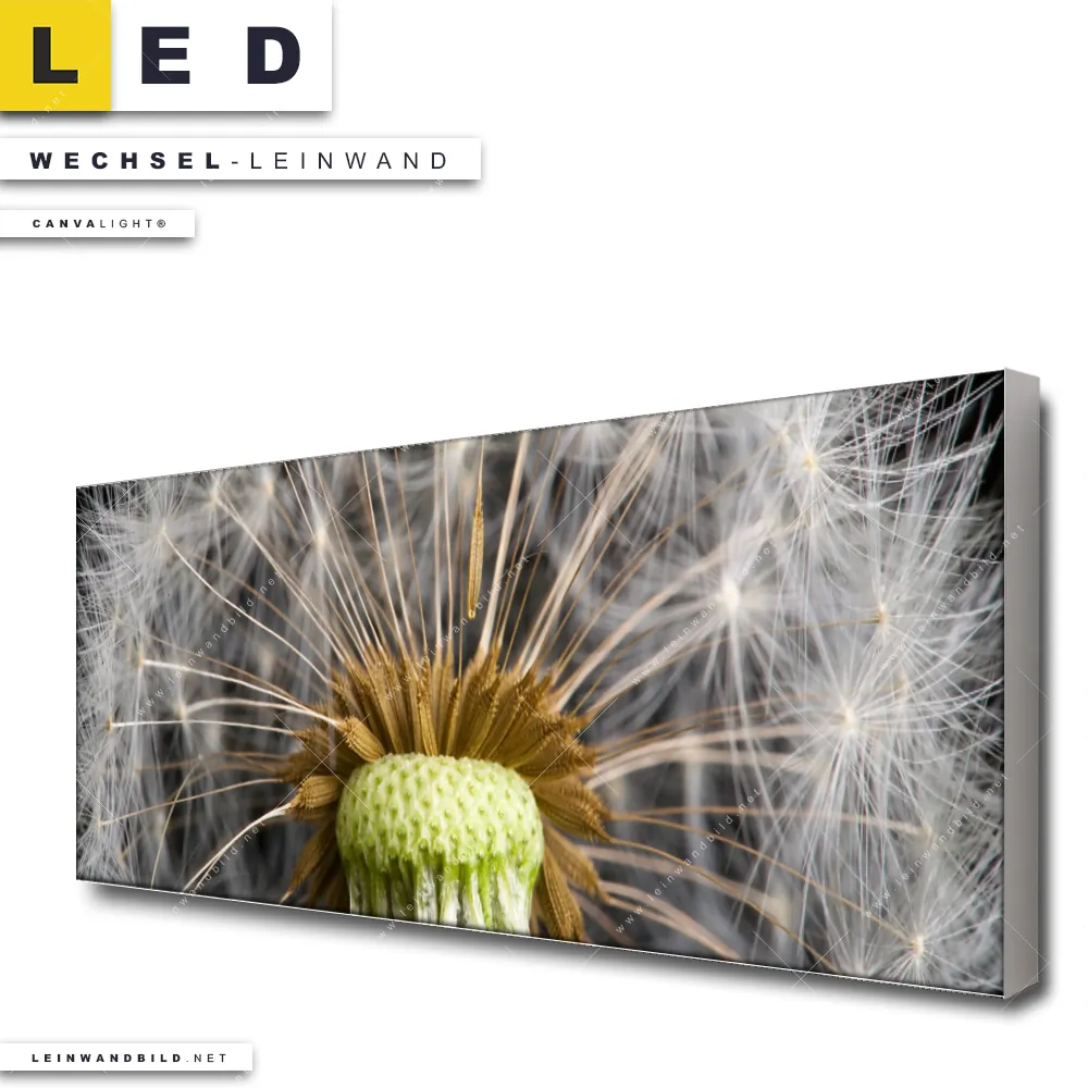 Du bist auf der Suche nach einer Blumen - Botanik Wechsel-Leinwand für Dein LED-Leinwandbild im Panorama-Format? Begriffe wie Blume, Botanik, Pflanze, Natur, Nahaufnahme, Pusteblume, Dandelion, Löwenzahn haben Dich auf der Suche nach Deiner Ersatz-Leinwand für dein extra breites LED Wandbild mit wechselbarer Leinwand inspiriert? Farben wie Schwarz, Hellgrün, Braun, Weiss, Ocker dürfen auf Deinem neuen Wechselmotiv für Dein XXL Leinwand-LED-Bild nicht fehlen und Leinwände im Floral, Natürlich - Realistisch Stil für Leuchtbilder passen perfekt zu Deinem Einrichtungsstil?