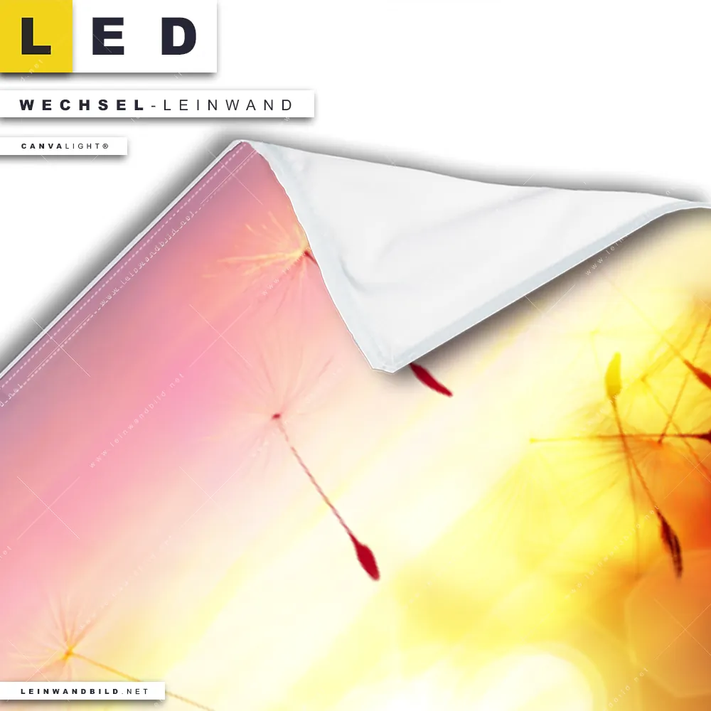 Bitte beachte, dass die Farben, der auf dem Monitor abgebildeten Samen Löwenzahn fliegt vor Sonnenuntergang Darstellung, möglicherweise von den Originalfarben deiner Canvalight® TEX Wechsel-Leinwand abweichen können.