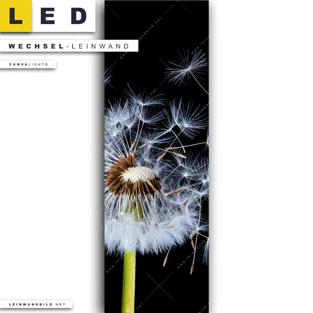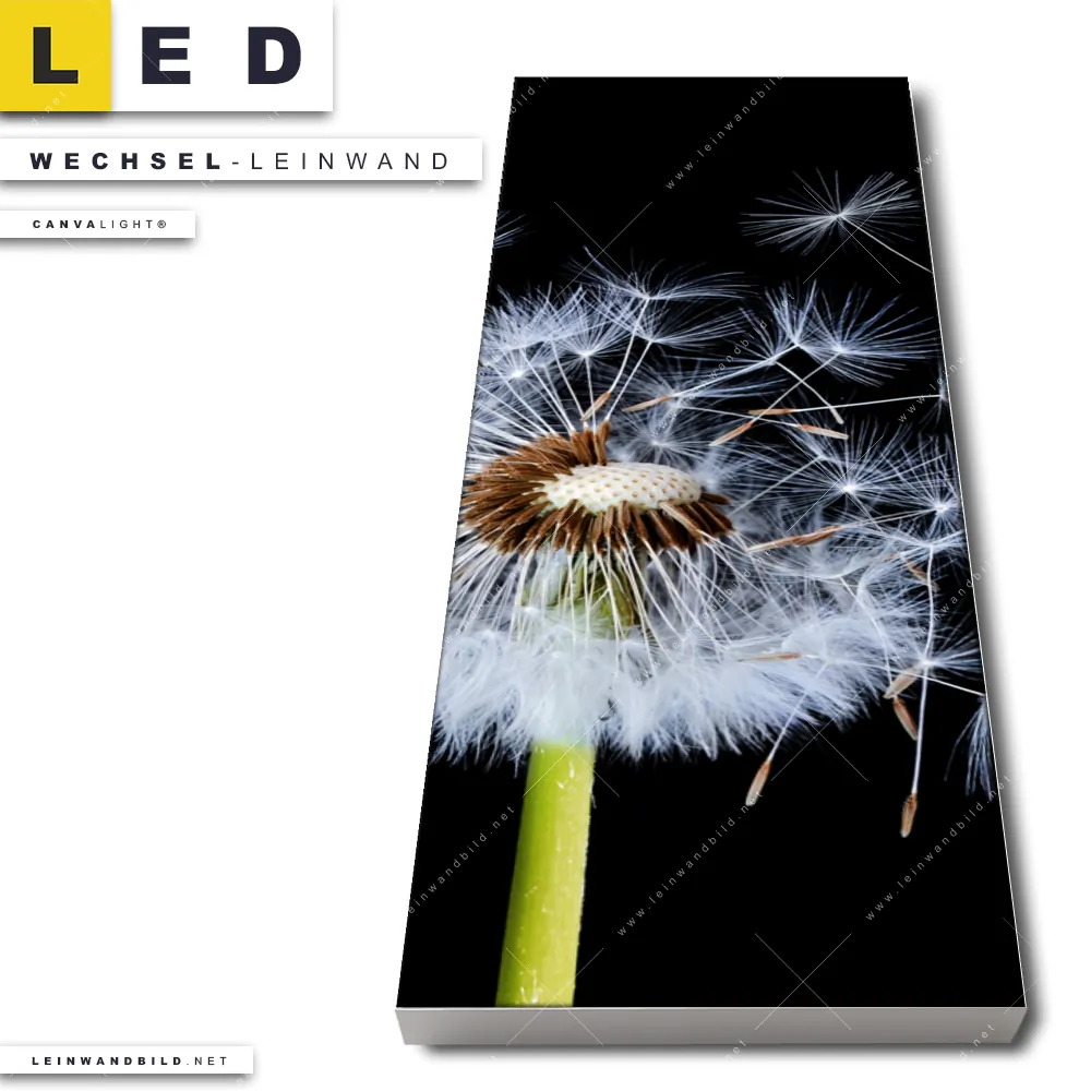 Du konfigurierst Deine individuelle LED Wechsel-Leinwand Canvalight® TEX | Pusteblume No. 6 | Schmal und wir produzieren sie NEU für Dich. Unsere Blumen - Botanik Austausch-Fotoleinwände für Canvalight® LED Bilder sind KEINE Lagerware. Du bist Dir unsicher, welches Motiv oder Format das richtige für dein individuelles LED Wechselmotiv auf Leinwand ist, dann helfen wir dir gerne weiter und beraten dich!