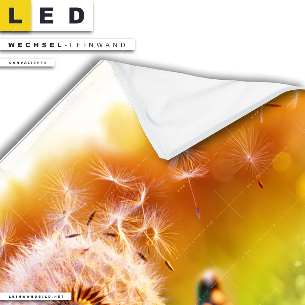 Du konfigurierst Deine individuelle LED Wechsel-Leinwand Canvalight® TEX | Pusteblume No. 8 | Querformat und wir produzieren sie NEU für Dich. Unsere Blumen - Botanik Austausch-Fotoleinwände für Canvalight® LED Bilder sind KEINE Lagerware. Du bist Dir unsicher, welches Motiv oder Format das richtige für dein individuelles LED Wechselmotiv auf Leinwand ist, dann helfen wir dir gerne weiter und beraten dich!
