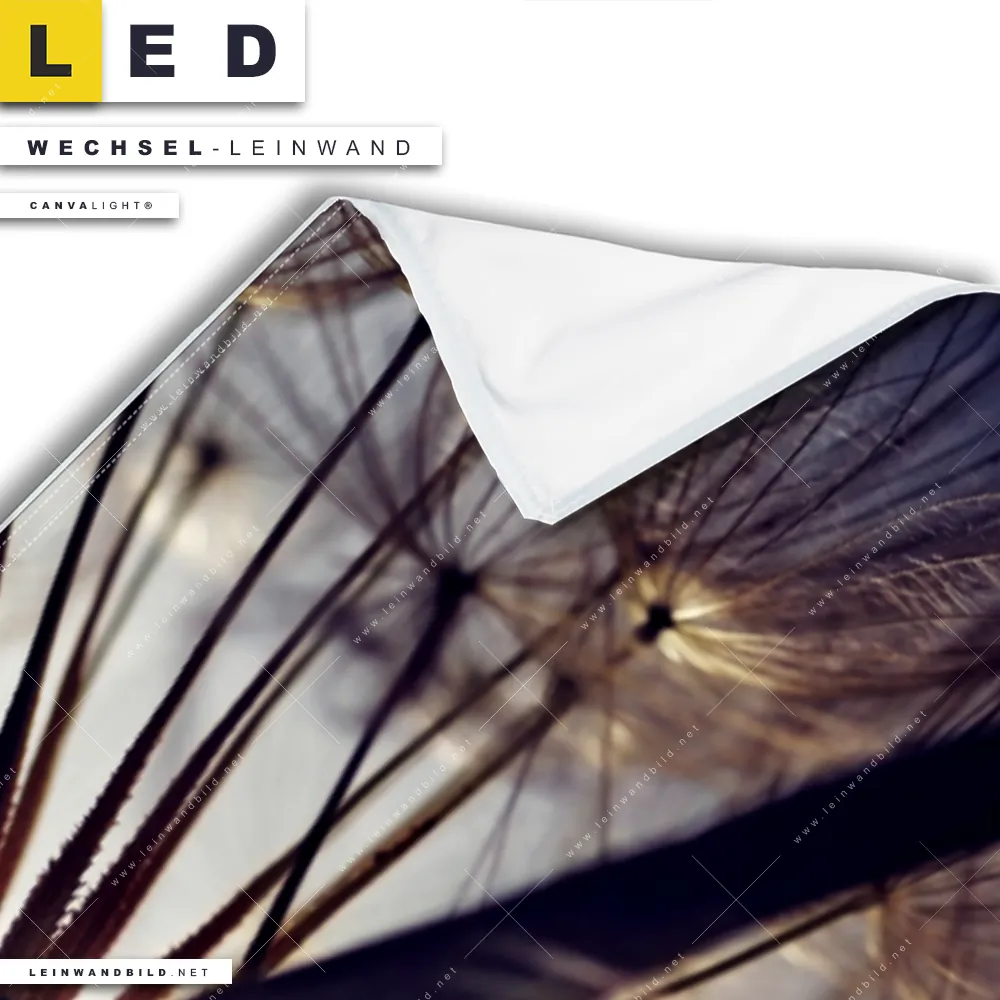 Du konfigurierst Deine individuelle LED Wechsel-Leinwand Canvalight® TEX | Pusteblume | Panorama und wir produzieren sie NEU für Dich. Unsere Blumen - Botanik Austausch-Fotoleinwände für Canvalight® LED Bilder sind KEINE Lagerware. Du bist Dir unsicher, welches Motiv oder Format das richtige für dein individuelles LED Wechselmotiv auf Leinwand ist, dann helfen wir dir gerne weiter und beraten dich!