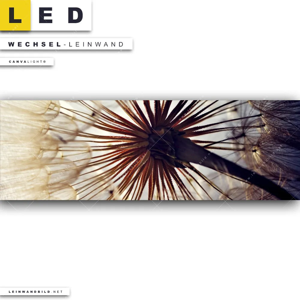Du bist auf der Suche nach einer Blumen - Botanik Wechsel-Leinwand für Dein LED-Leinwandbild im Panorama-Format? Begriffe wie Blume, Botanik, Pflanze, Natur, Nahaufnahme, Pusteblume, Dandelion haben Dich auf der Suche nach Deiner Ersatz-Leinwand für dein extra breites LED Wandbild mit wechselbarer Leinwand inspiriert? Farben wie Beige, Weiss dürfen auf Deinem neuen Wechselmotiv für Dein XXL Leinwand-LED-Bild nicht fehlen und Leinwände im Floral, Natürlich - Realistisch Stil für Leuchtbilder passen perfekt zu Deinem Einrichtungsstil?