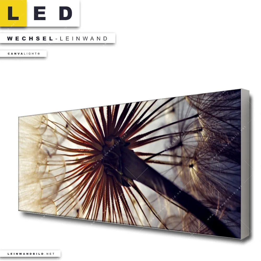 Dann sollte die Wechsel-Leinwand Canvalight® TEX | Pusteblume | Panorama den Weg zu Dir finden. Die Austausch-Leinwand Pusteblume mit vielen Samen - passend für unsere stufenlos dimmbaren, steckerfertigen Leinwandbilder im LED Leuchtrahmen mit Fernbedienung und optionaler Farbtemperatursteuerung - fügt sich als Eye-Catcher harmonisch in jedes Arzt - Praxis, Büro - Kanzlei, Wohnzimmer - Schlafzimmer Raumkonzept ein.