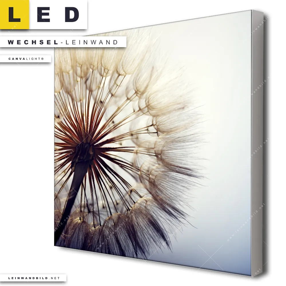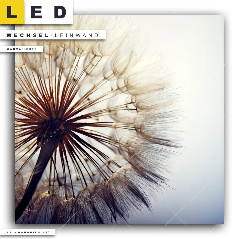 Du konfigurierst Deine individuelle LED Wechsel-Leinwand Canvalight® TEX | Pusteblume | Quadrat und wir produzieren sie NEU für Dich. Unsere Blumen - Botanik Austausch-Fotoleinwände für Canvalight® LED Bilder sind KEINE Lagerware. Du bist Dir unsicher, welches Motiv oder Format das richtige für dein individuelles LED Wechselmotiv auf Leinwand ist, dann helfen wir dir gerne weiter und beraten dich!