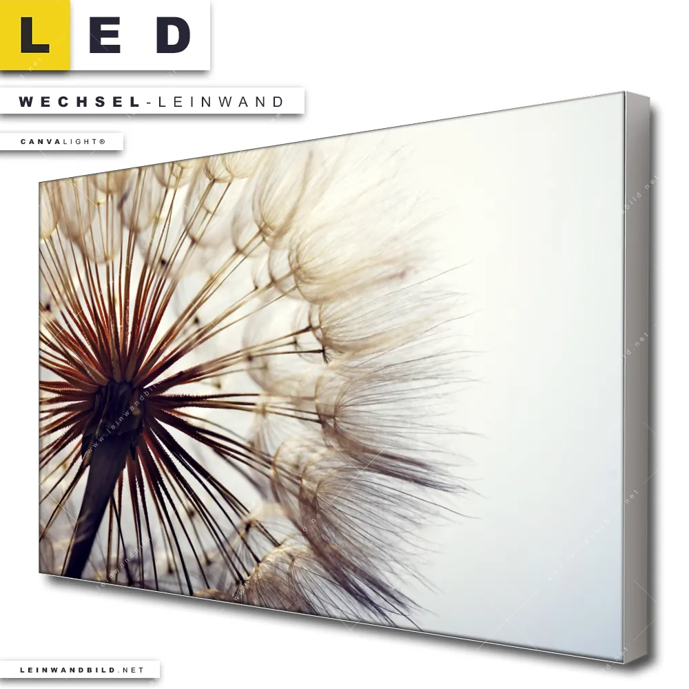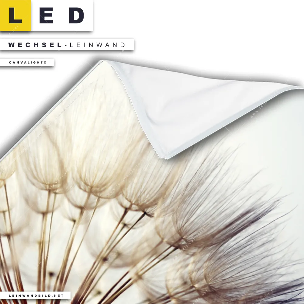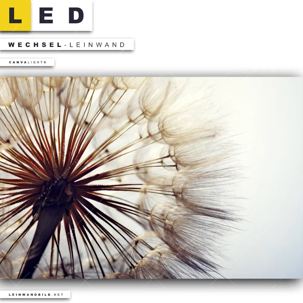 Du bist auf der Suche nach einer Blumen - Botanik Wechsel-Leinwand für Dein LED-Leinwandbild im Querformat? Begriffe wie Blume, Botanik, Pflanze, Natur, Nahaufnahme, Pusteblume, Dandelion haben Dich auf der Suche nach Deiner Ersatz-Leinwand für dein breites LED Wandbild mit wechselbarer Leinwand inspiriert? Farben wie Beige, Weiss dürfen auf Deinem neuen Wechselmotiv für Dein XXL Leinwand-LED-Bild nicht fehlen und Leinwände im Floral, Natürlich - Realistisch Stil für Leuchtbilder passen perfekt zu Deinem Einrichtungsstil?