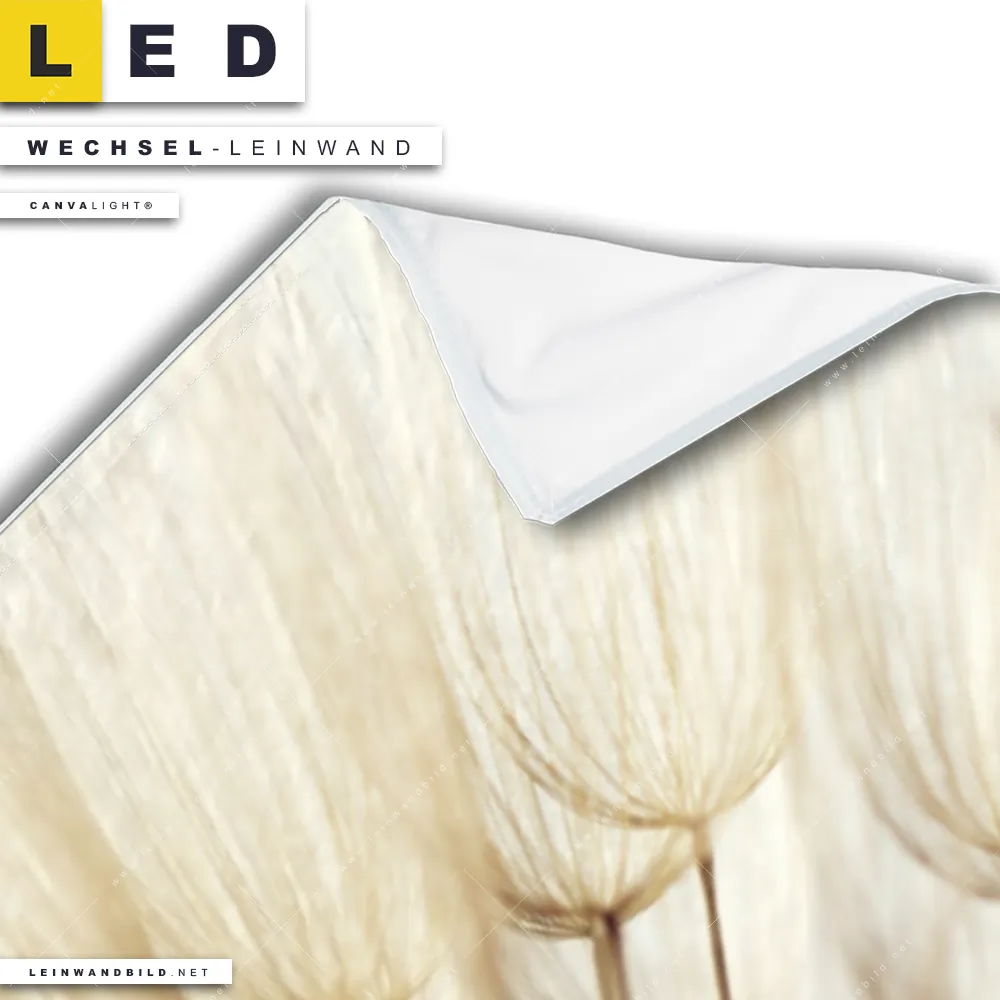 Du bist auf der Suche nach einer Blumen - Botanik Wechsel-Leinwand für Dein LED-Leinwandbild im Schmalen Format? Begriffe wie Blume, Botanik, Pflanze, Natur, Nahaufnahme, Pusteblume, Dandelion haben Dich auf der Suche nach Deiner Ersatz-Leinwand für dein LED Wandbild im Panorama-Hochformat mit wechselbarer Leinwand inspiriert? Farben wie Beige, Weiss dürfen auf Deinem neuen Wechselmotiv für Dein XXL Leinwand-LED-Bild nicht fehlen und Leinwände im Floral, Natürlich - Realistisch Stil für Leuchtbilder passen perfekt zu Deinem Einrichtungsstil?
