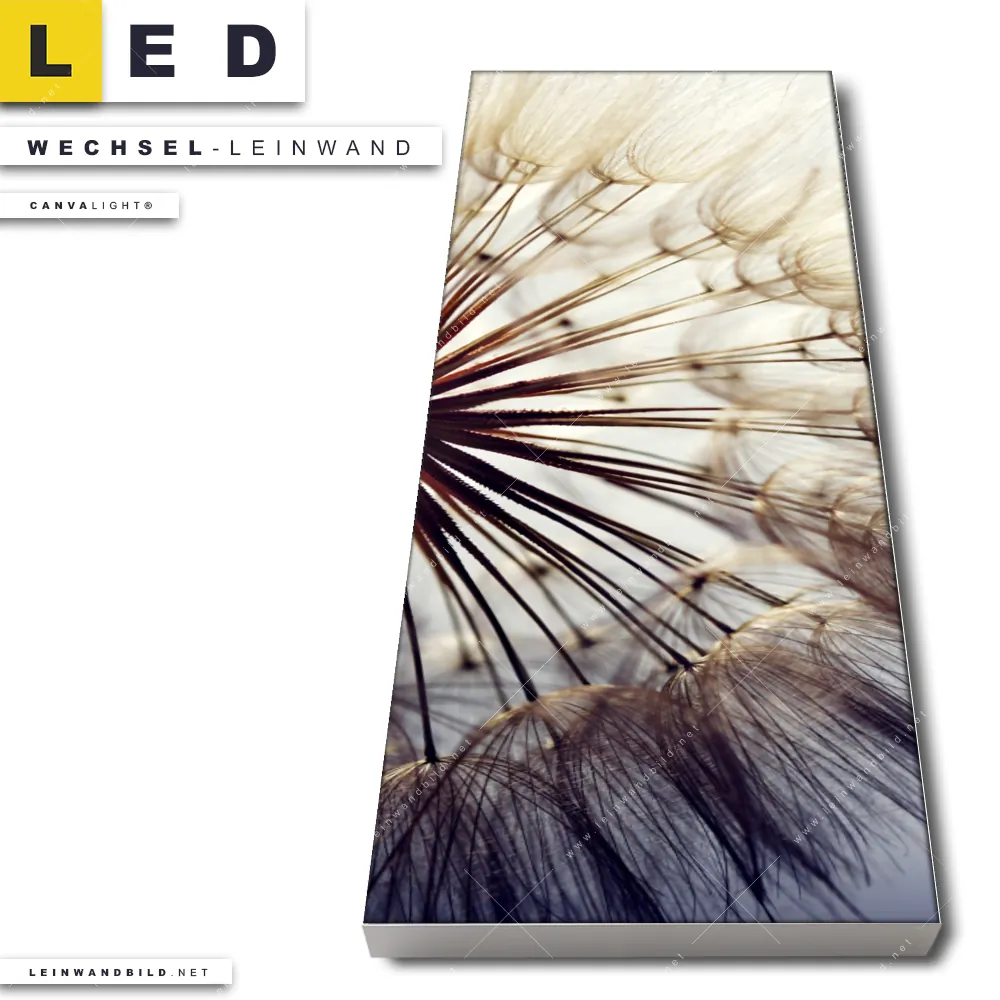 Du konfigurierst Deine individuelle LED Wechsel-Leinwand Canvalight® TEX | Pusteblume | Schmal und wir produzieren sie NEU für Dich. Unsere Blumen - Botanik Austausch-Fotoleinwände für Canvalight® LED Bilder sind KEINE Lagerware. Du bist Dir unsicher, welches Motiv oder Format das richtige für dein individuelles LED Wechselmotiv auf Leinwand ist, dann helfen wir dir gerne weiter und beraten dich!