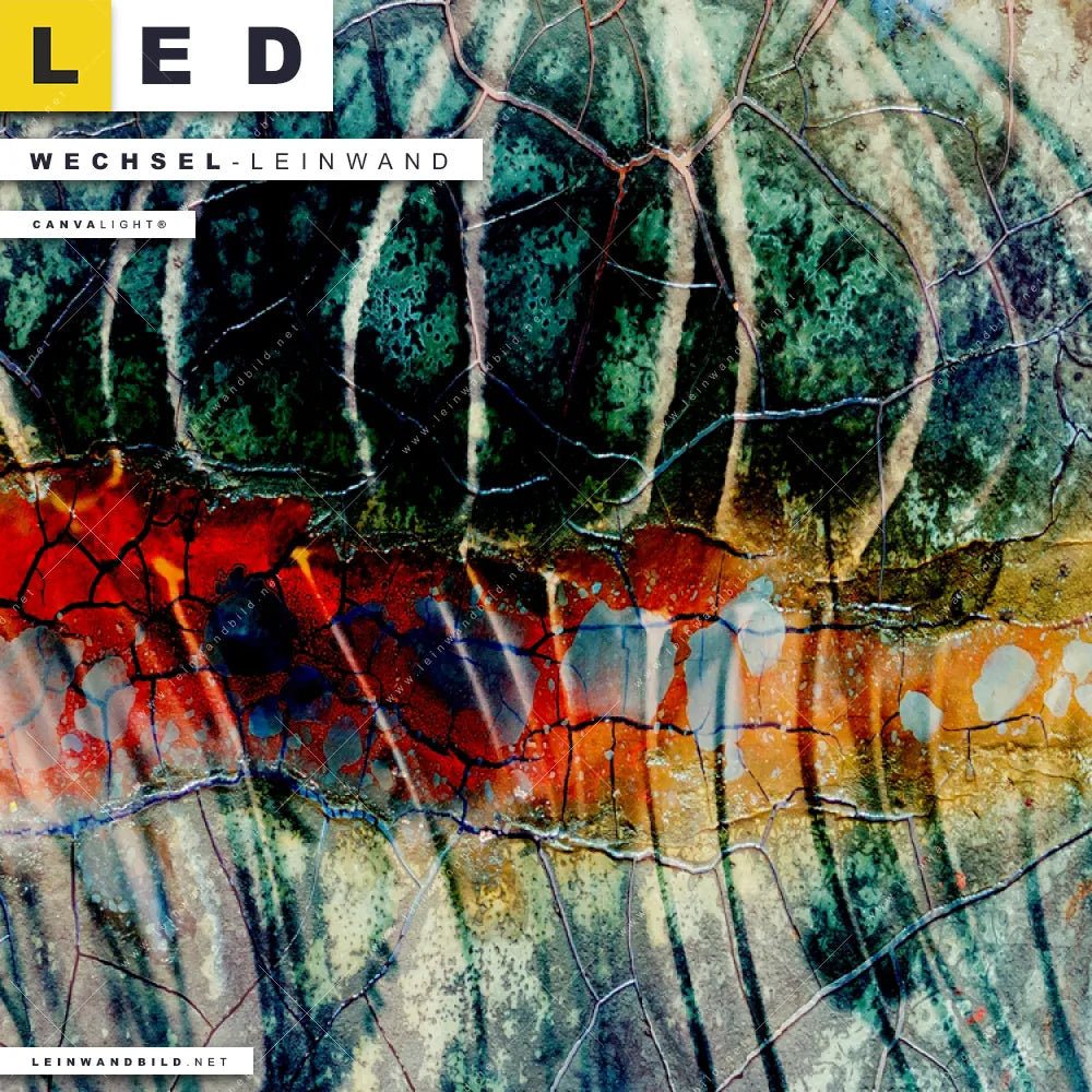 Bitte beachte, dass die Farben, der auf dem Monitor abgebildeten Abstraktes Quallen Erdkunstwerk Darstellung, möglicherweise von den Originalfarben deiner Canvalight® TEX Wechsel-Leinwand abweichen können.