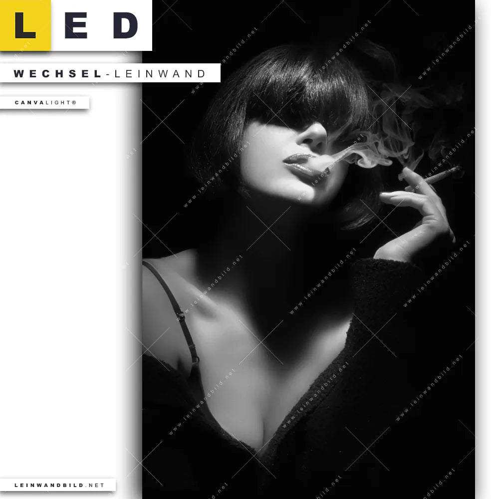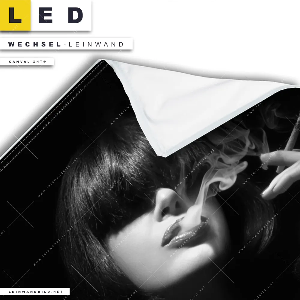Dann sollte die Wechsel-Leinwand Canvalight® TEX | Rauchende Lady | Hochformat den Weg zu Dir finden. Die Austausch-Leinwand elegant rauchende Dame - passend für unsere stufenlos dimmbaren, steckerfertigen Leinwandbilder im Leuchtrahmen mit Fernbedienung und optionaler Farbtemperatursteuerung - fügt sich als Eye-Catcher harmonisch in jedes Friseur - Beauty, Bar - Gastronomie, Wohnzimmer - Schlafzimmer Raumkonzept ein.