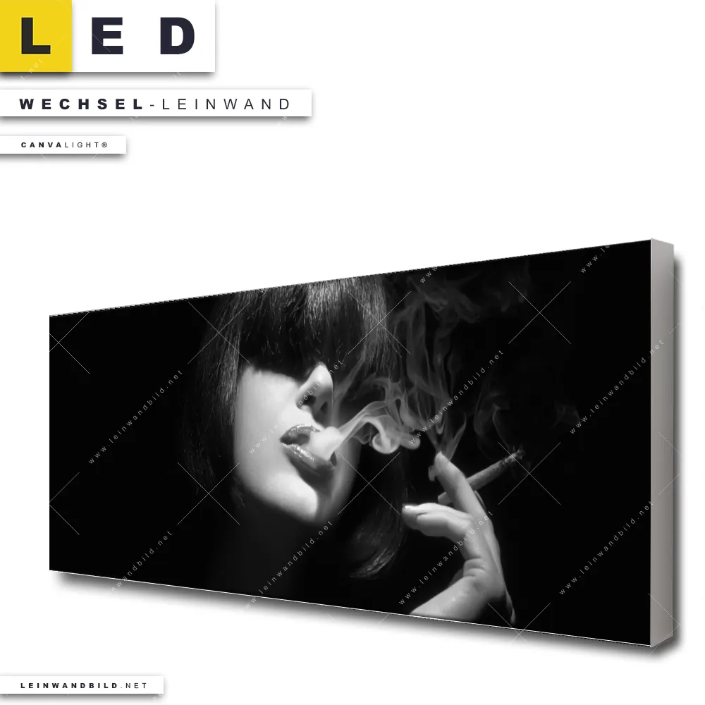 Dann sollte die Wechsel-Leinwand Canvalight® TEX | Rauchende Lady | Panorama den Weg zu Dir finden. Die Austausch-Leinwand verruchte Versuchung - passend für unsere stufenlos dimmbaren, steckerfertigen Leinwandbilder im LED Leuchtrahmen mit Fernbedienung und optionaler Farbtemperatursteuerung - fügt sich als Eye-Catcher harmonisch in jedes Friseur - Beauty, Bar - Gastronomie, Wohnzimmer - Schlafzimmer Raumkonzept ein.