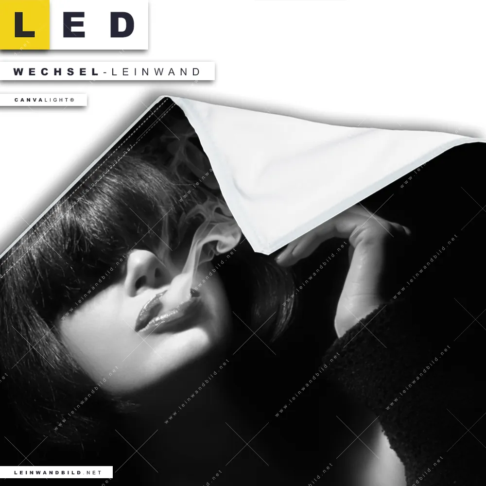 Dann sollte die Wechsel-Leinwand Canvalight® TEX | Rauchende Lady | Querformat den Weg zu Dir finden. Die Austausch-Leinwand rauchende Frau - passend für unsere stufenlos dimmbaren, steckerfertigen Leinwandbilder im Leuchtrahmen mit Fernbedienung und optionaler Farbtemperatursteuerung - fügt sich als Eye-Catcher harmonisch in jedes Friseur - Beauty, Bar - Gastronomie, Wohnzimmer - Schlafzimmer Raumkonzept ein.