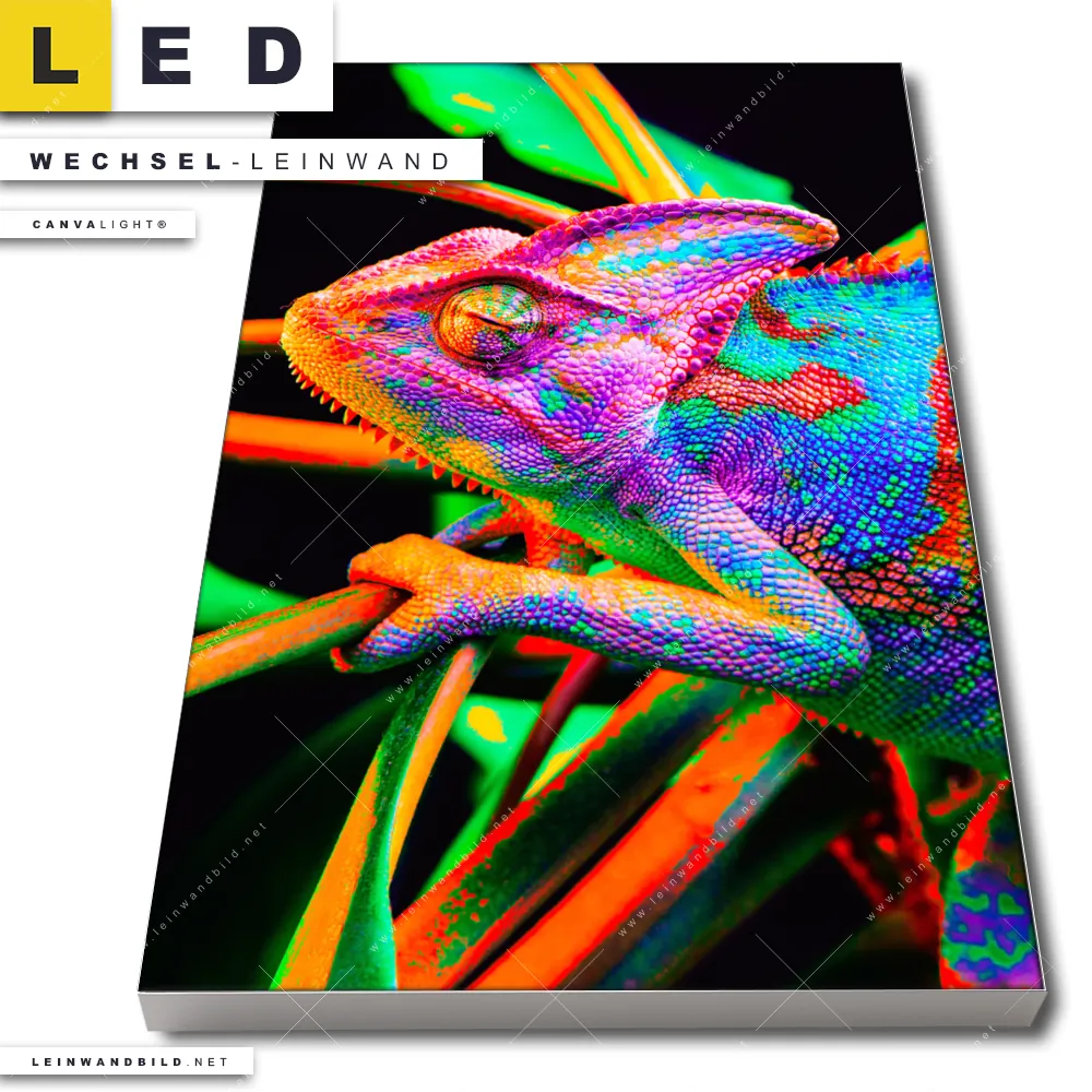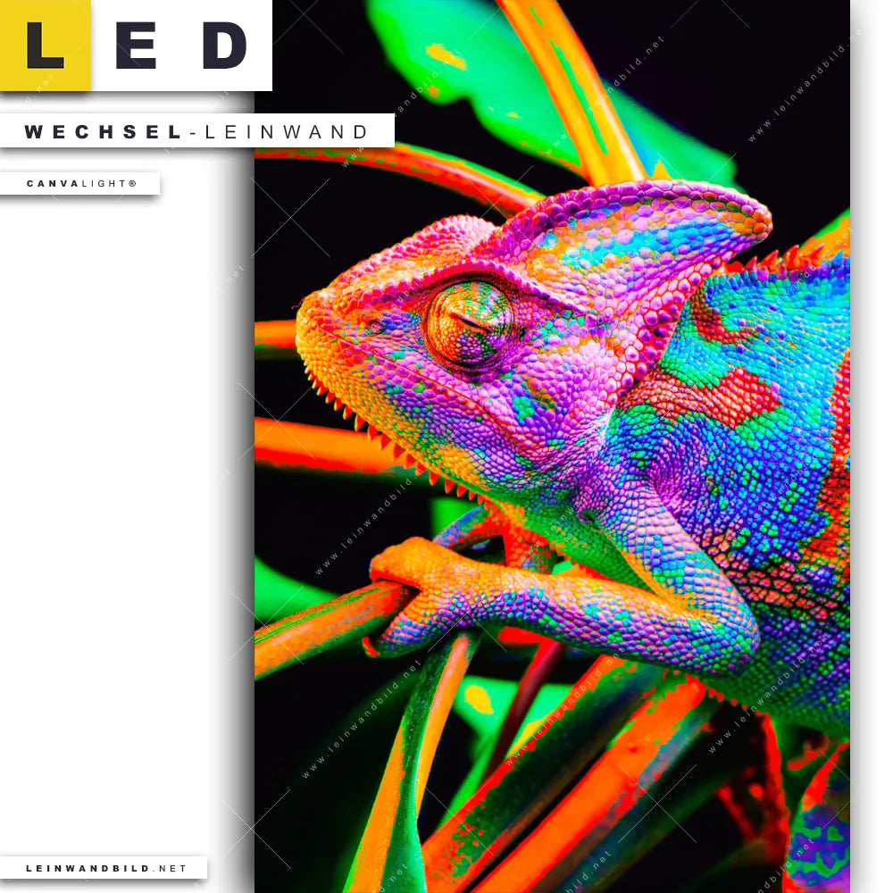 Du bist auf der Suche nach einer Tierwelt Wechsel-Leinwand für Dein LED-Leinwandbild im Hochformat? Begriffe wie Tiere, Farbe, bunt, Chamäleon, Regenbogen, Pop Art haben Dich auf der Suche nach Deiner Ersatz-Leinwand für dein LED Wandbild mit wechselbarer Leinwand inspiriert? Farben wie Bunt dürfen auf Deinem neuen Wechselmotiv für Dein XXL Leinwand-LED-Bild nicht fehlen und Leinwände im Mixed Media, Modern Art, Pop Art Stil für Leuchtbilder passen perfekt zu Deinem Einrichtungsstil?