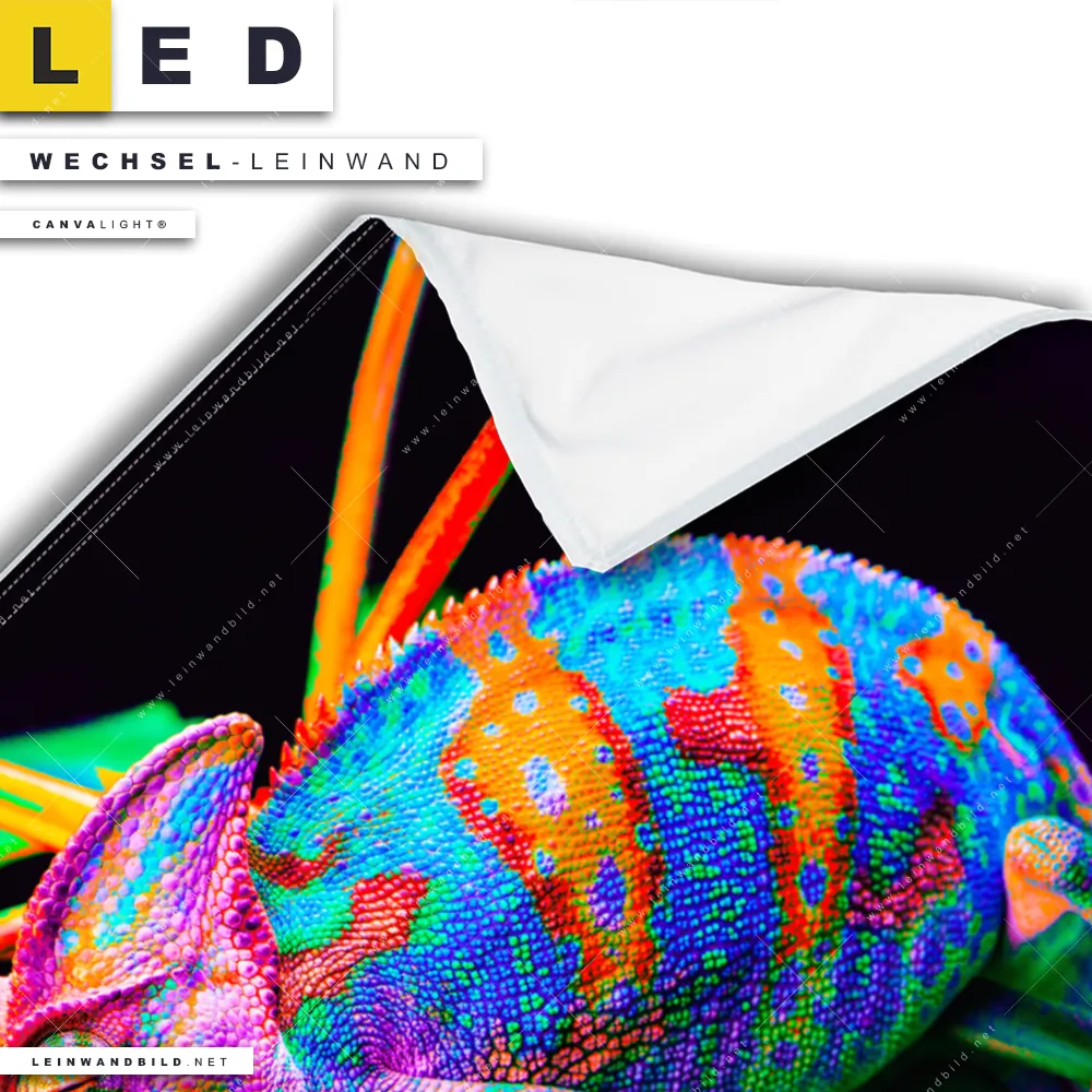 Du konfigurierst Deine individuelle LED Wechsel-Leinwand Canvalight® TEX | Regenbogen Chamäleon No.2 | Querformat und wir produzieren sie NEU für Dich. Unsere Tierwelt Austausch-Fotoleinwände für Canvalight® LED Bilder sind KEINE Lagerware. Du bist Dir unsicher, welches Motiv oder Format das richtige für dein individuelles LED Wechselmotiv auf Leinwand ist, dann helfen wir dir gerne weiter und beraten dich!