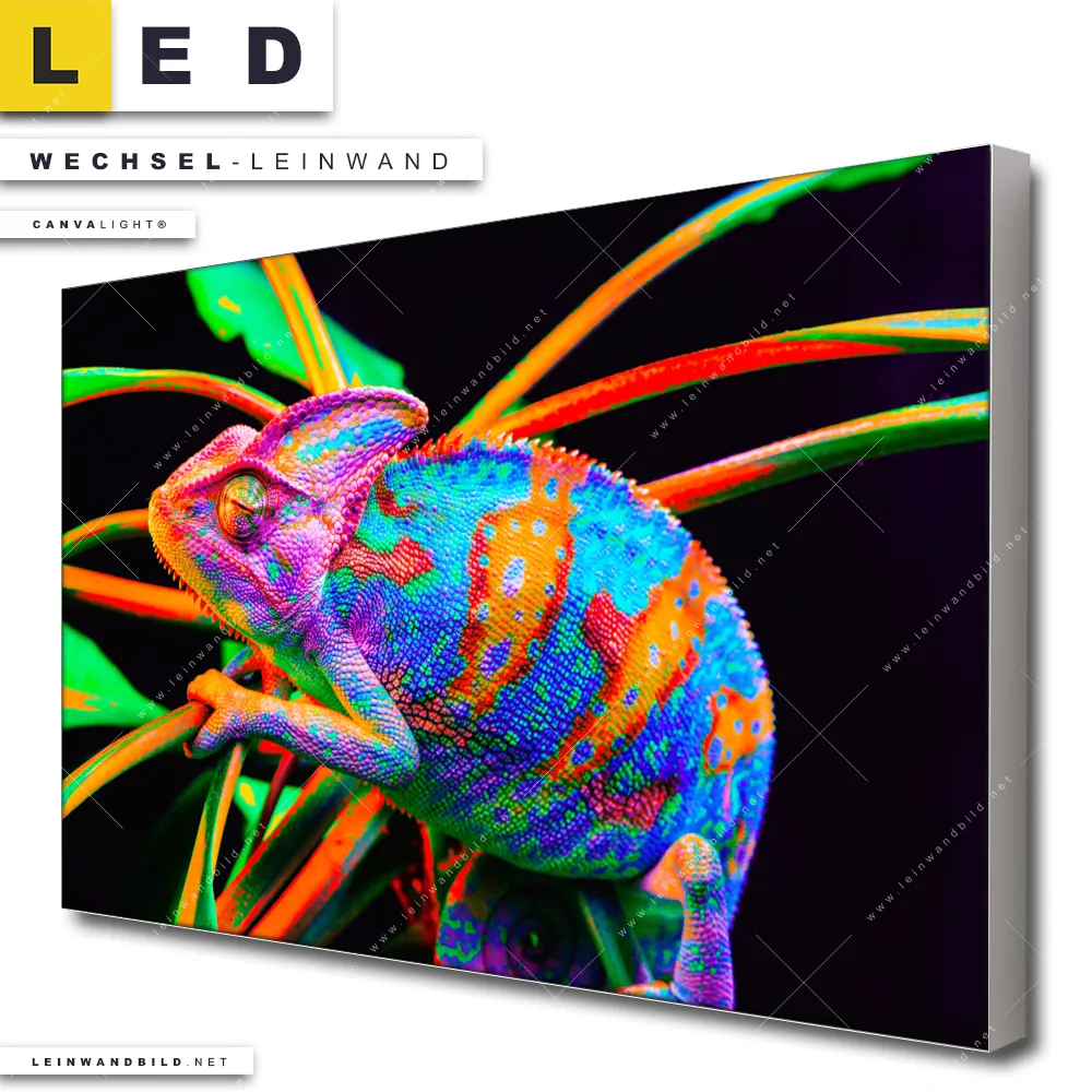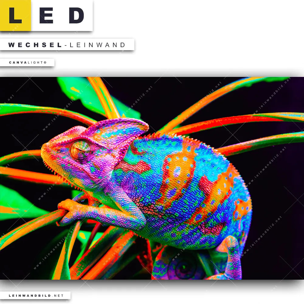 Du bist auf der Suche nach einer Tierwelt Wechsel-Leinwand für Dein LED-Leinwandbild im Querformat? Begriffe wie Tiere, Farbe, bunt, Chamäleon, Regenbogen, Pop Art haben Dich auf der Suche nach Deiner Ersatz-Leinwand für dein breites LED Wandbild mit wechselbarer Leinwand inspiriert? Farben wie Bunt dürfen auf Deinem neuen Wechselmotiv für Dein XXL Leinwand-LED-Bild nicht fehlen und Leinwände im Mixed Media, Modern Art, Pop Art Stil für Leuchtbilder passen perfekt zu Deinem Einrichtungsstil?