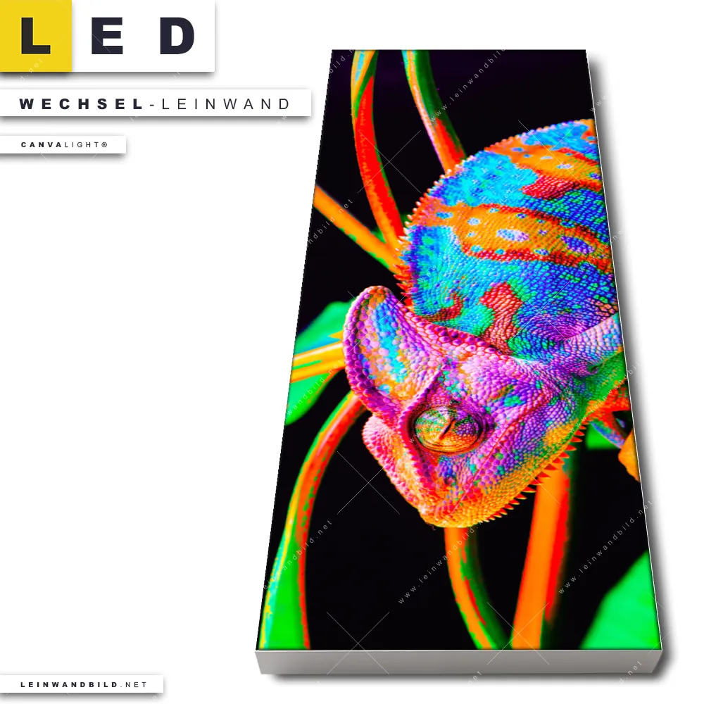 Du konfigurierst Deine individuelle LED Wechsel-Leinwand Canvalight® TEX | Regenbogen Chamäleon No.2 | Schmal und wir produzieren sie NEU für Dich. Unsere Tierwelt Austausch-Fotoleinwände für Canvalight® LED Bilder sind KEINE Lagerware. Du bist Dir unsicher, welches Motiv oder Format das richtige für dein individuelles LED Wechselmotiv auf Leinwand ist, dann helfen wir dir gerne weiter und beraten dich!