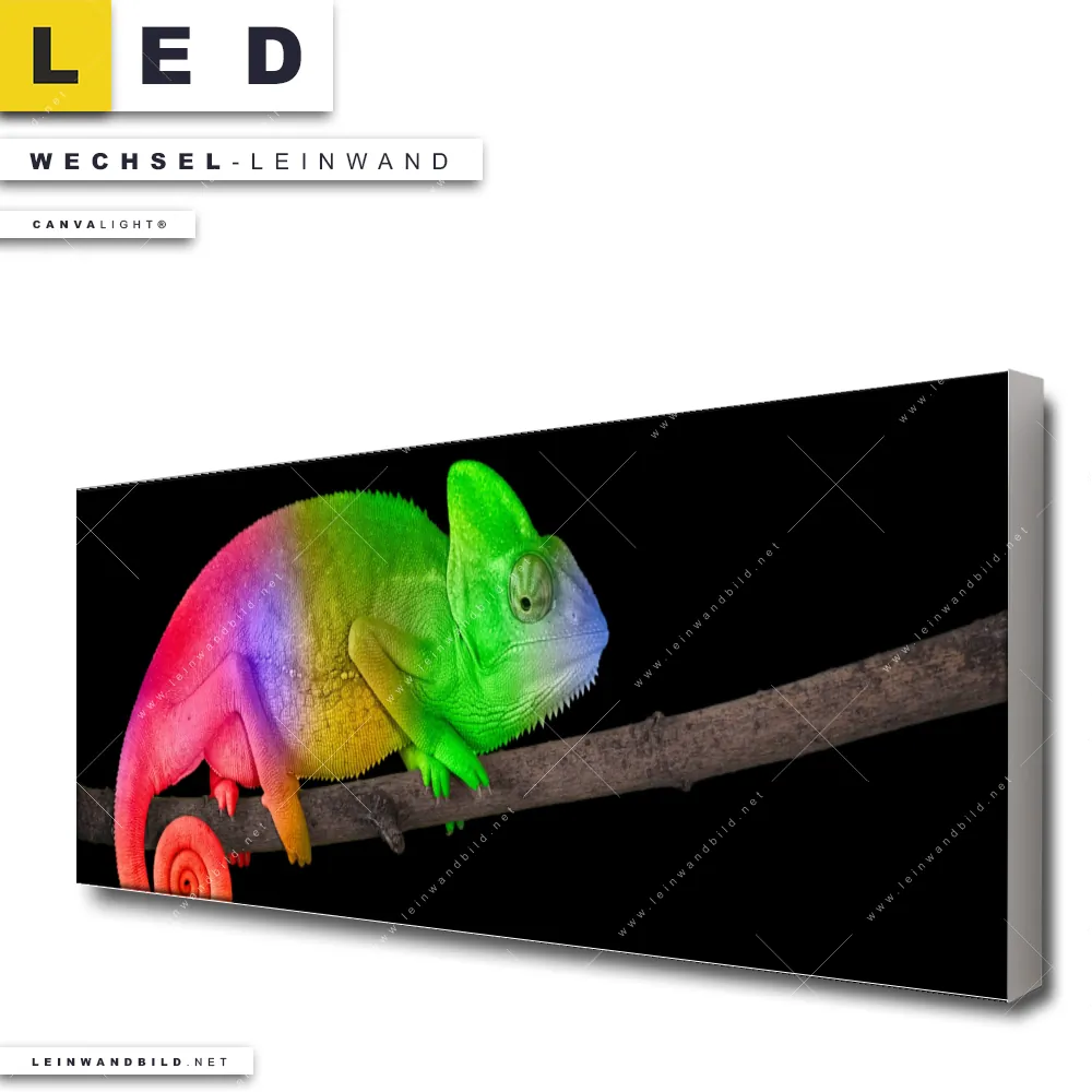 Du bist auf der Suche nach einer Tierwelt Wechsel-Leinwand für Dein LED-Leinwandbild im Panorama-Format? Begriffe wie Tiere, Farbe, bunt, Chamäleon, Regenbogen, Pop Art haben Dich auf der Suche nach Deiner Ersatz-Leinwand für dein extra breites LED Wandbild mit wechselbarer Leinwand inspiriert? Farben wie Schwarz, Bunt dürfen auf Deinem neuen Wechselmotiv für Dein XXL Leinwand-LED-Bild nicht fehlen und Leinwände im Mixed Media, Modern Art, Pop Art Stil für Leuchtbilder passen perfekt zu Deinem Einrichtungsstil?