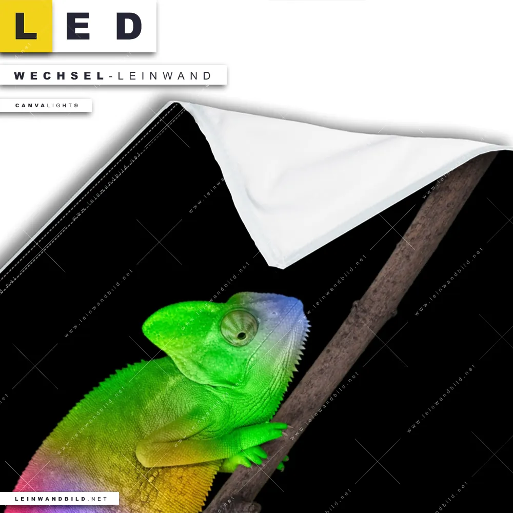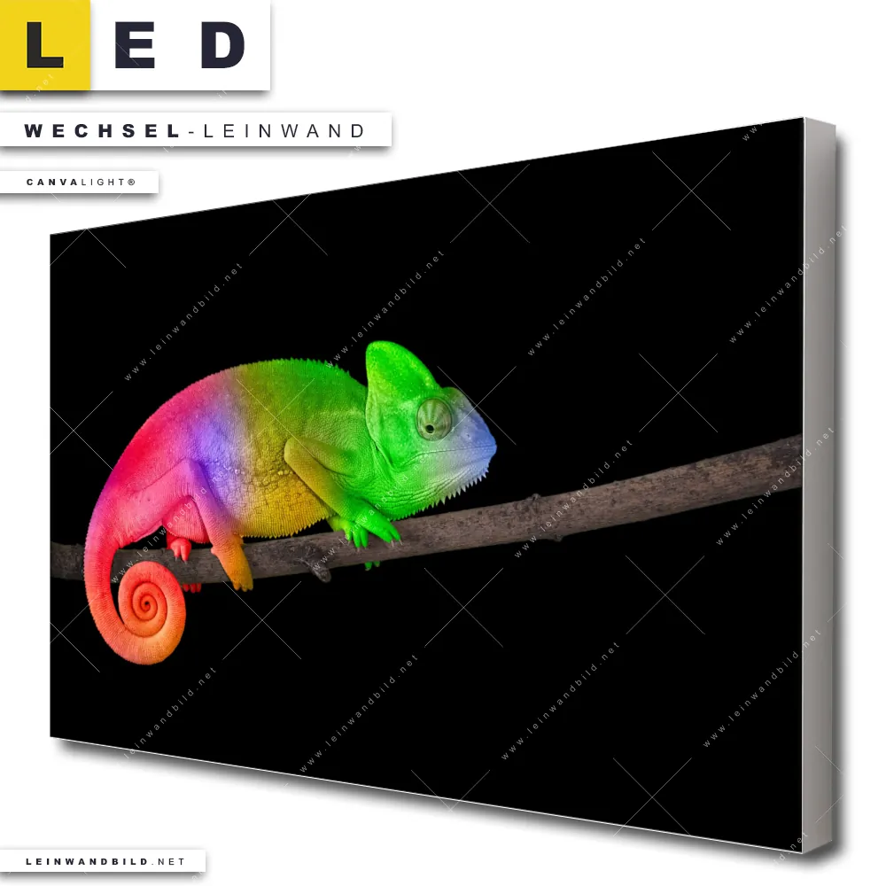 Du konfigurierst Deine individuelle LED Wechsel-Leinwand Canvalight® TEX | Regenbogen Chamäleon | Querformat und wir produzieren sie NEU für Dich. Unsere Tierwelt Austausch-Fotoleinwände für Canvalight® LED Bilder sind KEINE Lagerware. Du bist Dir unsicher, welches Motiv oder Format das richtige für dein individuelles LED Wechselmotiv auf Leinwand ist, dann helfen wir dir gerne weiter und beraten dich!