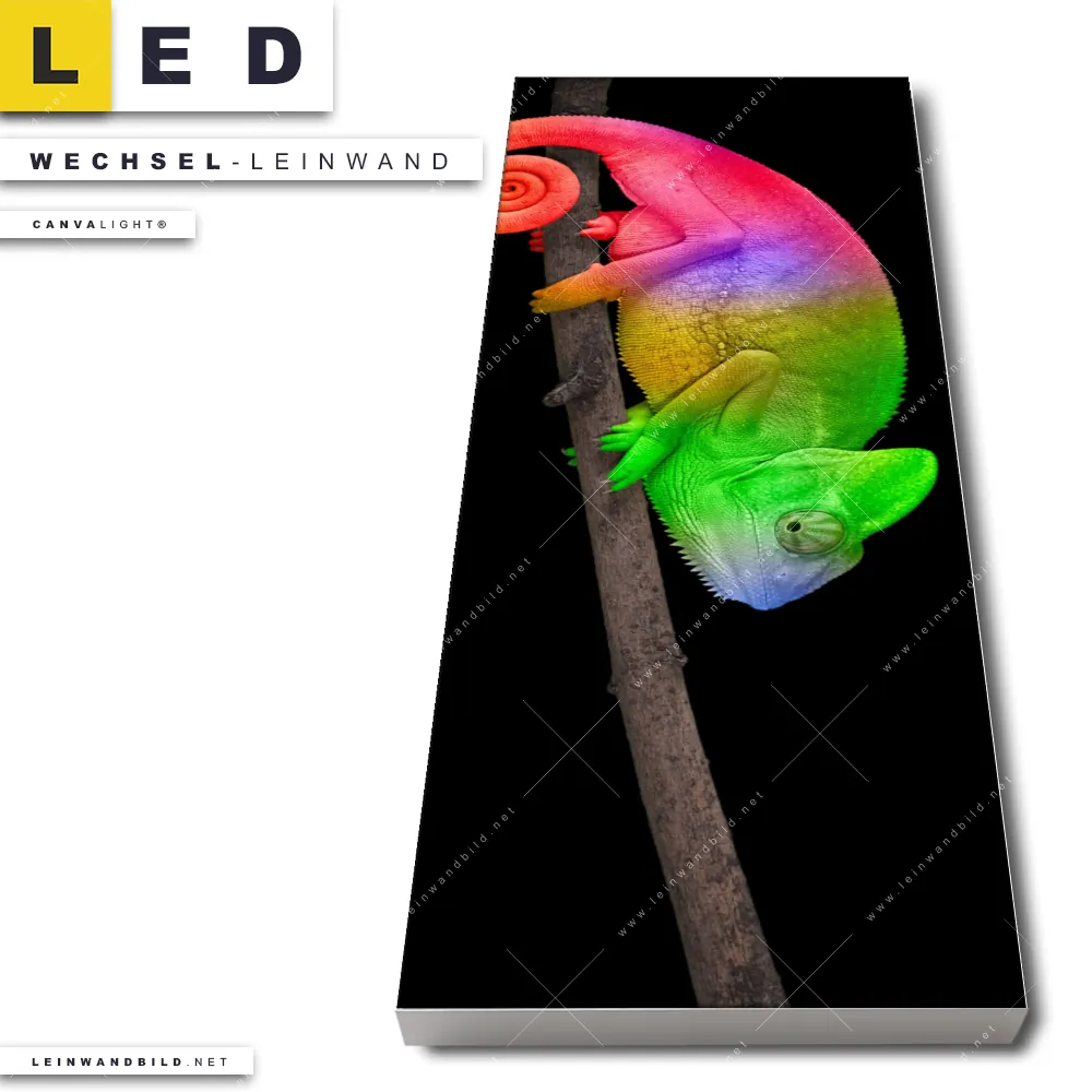 Du bist auf der Suche nach einer Tierwelt Wechsel-Leinwand für Dein LED-Leinwandbild im Schmalen Format? Begriffe wie Tiere, Farbe, bunt, Chamäleon, Regenbogen, Pop Art haben Dich auf der Suche nach Deiner Ersatz-Leinwand für dein LED Wandbild im Panorama-Hochformat mit wechselbarer Leinwand inspiriert? Farben wie Schwarz, Bunt dürfen auf Deinem neuen Wechselmotiv für Dein XXL Leinwand-LED-Bild nicht fehlen und Leinwände im Mixed Media, Modern Art, Pop Art Stil für Leuchtbilder passen perfekt zu Deinem Einrichtungsstil?