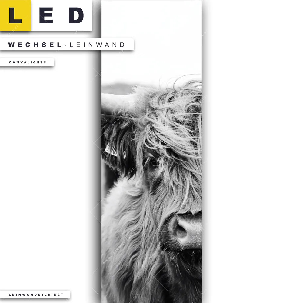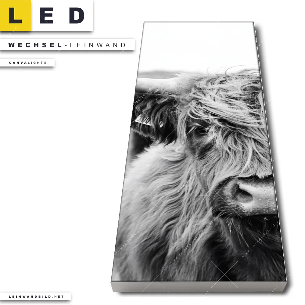 Du bist auf der Suche nach einer Tierwelt Wechsel-Leinwand für Dein LED-Leinwandbild im Schmalen Format? Begriffe wie Tier, Stier, Hochlandkuh, Highlander, Büffel, Rind, Bulle, Hochlandrind haben Dich auf der Suche nach Deiner Ersatz-Leinwand für dein LED Wandbild im Panorama-Hochformat mit wechselbarer Leinwand inspiriert? Farben wie Schwarz, Weiss dürfen auf Deinem neuen Wechselmotiv für Dein XXL Leinwand-LED-Bild nicht fehlen und Leinwände im Natürlich - Realistisch, Schwarz - Weiss Stil für Leuchtbilder passen perfekt zu Deinem Einrichtungsstil?