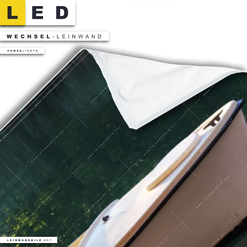 Bitte beachte, dass die Farben, der auf dem Monitor abgebildeten Boot in verträumter Kulisse Darstellung, möglicherweise von den Originalfarben deiner Canvalight® TEX Wechsel-Leinwand abweichen können.