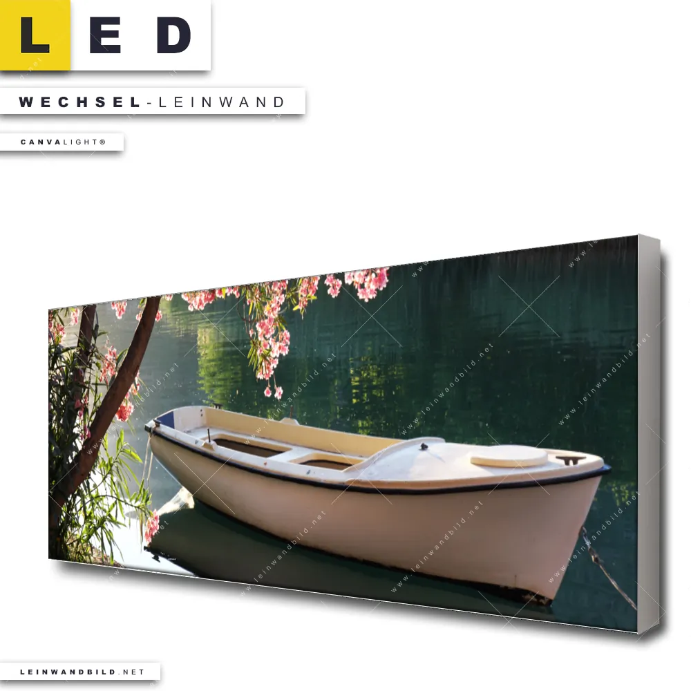 Dann sollte die Wechsel-Leinwand Canvalight® TEX | Romantische Bootstour | Panorama den Weg zu Dir finden. Die Austausch-Leinwand Baum in voller Blüte am Wasser mit Boot - passend für unsere stufenlos dimmbaren, steckerfertigen Leinwandbilder im LED Leuchtrahmen mit Fernbedienung und optionaler Farbtemperatursteuerung - fügt sich als Eye-Catcher harmonisch in jedes Arzt - Praxis, Bar - Gastronomie, Büro - Kanzlei, Wohnzimmer - Schlafzimmer Raumkonzept ein.