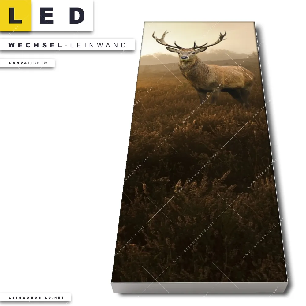 Du konfigurierst Deine individuelle LED Wechsel-Leinwand Canvalight® TEX | Rothirsch im Nebel | Schmal und wir produzieren sie NEU für Dich. Unsere Landschaften, Tierwelt Austausch-Fotoleinwände für Canvalight® LED Bilder sind KEINE Lagerware. Du bist Dir unsicher, welches Motiv oder Format das richtige für dein individuelles LED Wechselmotiv auf Leinwand ist, dann helfen wir dir gerne weiter und beraten dich!