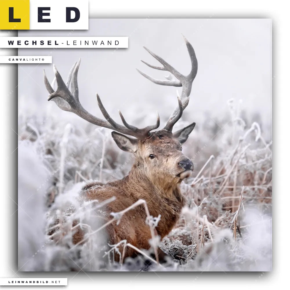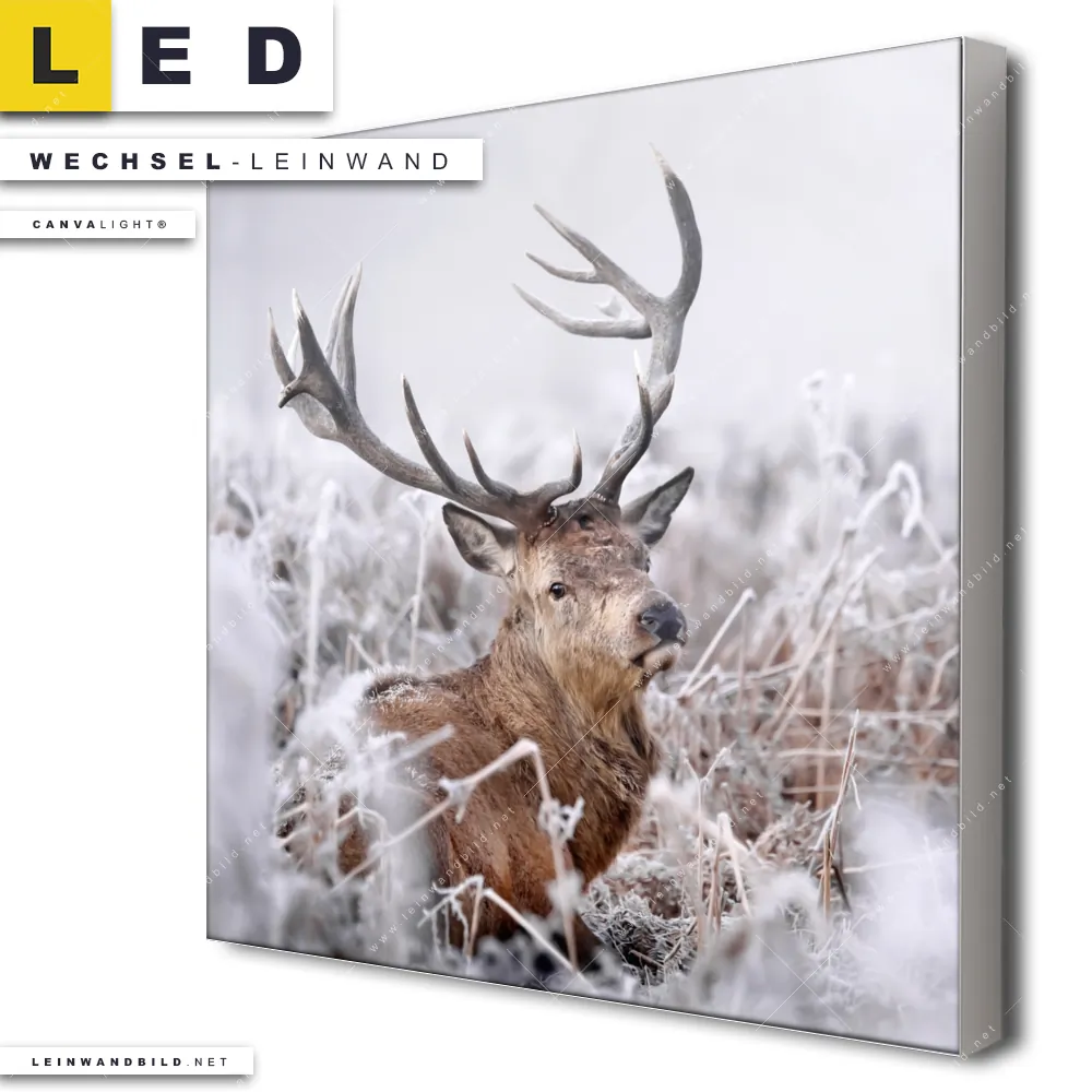 Du bist auf der Suche nach einer Landschaften, Tierwelt Wechsel-Leinwand für Dein LED-Leinwandbild im Quadratischen Format? Begriffe wie Wald, Natur, Hirsch, Deer, Wild, Rotwild, Feld, Winter, Schnee haben Dich auf der Suche nach Deiner Ersatz-Leinwand für dein LED Wandbild mit wechselbarer Leinwand inspiriert? Farben wie Beige, Braun, Weiss dürfen auf Deinem neuen Wechselmotiv für Dein XXL Leinwand-LED-Bild nicht fehlen und Leinwände im Natürlich - Realistisch Stil für Leuchtbilder passen perfekt zu Deinem Einrichtungsstil?