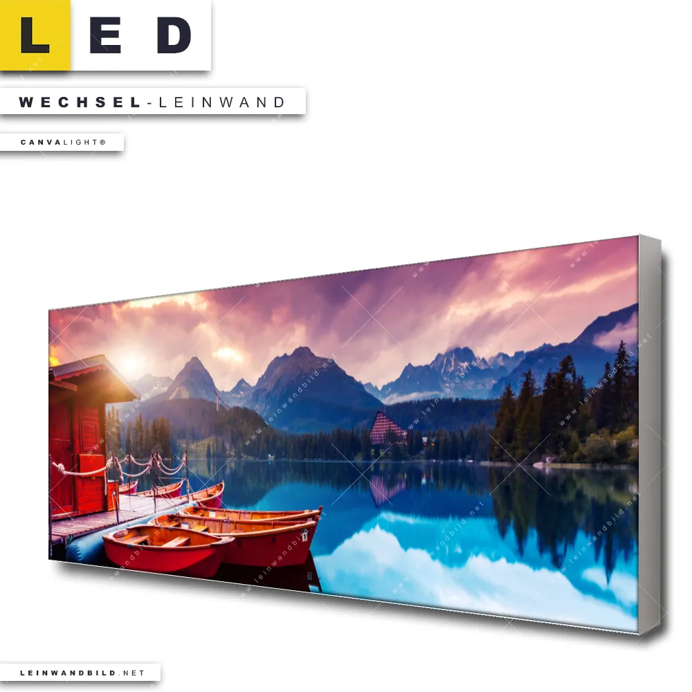 Du bist auf der Suche nach einer Landschaften Wechsel-Leinwand für Dein LED-Leinwandbild im Panorama-Format? Begriffe wie Natur, Stille, See, Wasser, Berge, Sonnenuntergang, Sonnenaufgang, Sonne, Gebirge, Boote, Boot, Bergsee, Urlaub, Reisen, Steg haben Dich auf der Suche nach Deiner Ersatz-Leinwand für dein extra breites LED Wandbild mit wechselbarer Leinwand inspiriert? Farben wie Orange, Blau, Rot dürfen auf Deinem neuen Wechselmotiv für Dein XXL Leinwand-LED-Bild nicht fehlen und Leinwände im Natürlich - Realistisch, Mixed Media Stil für Leuchtbilder passen perfekt zu Deinem Einrichtungsstil?